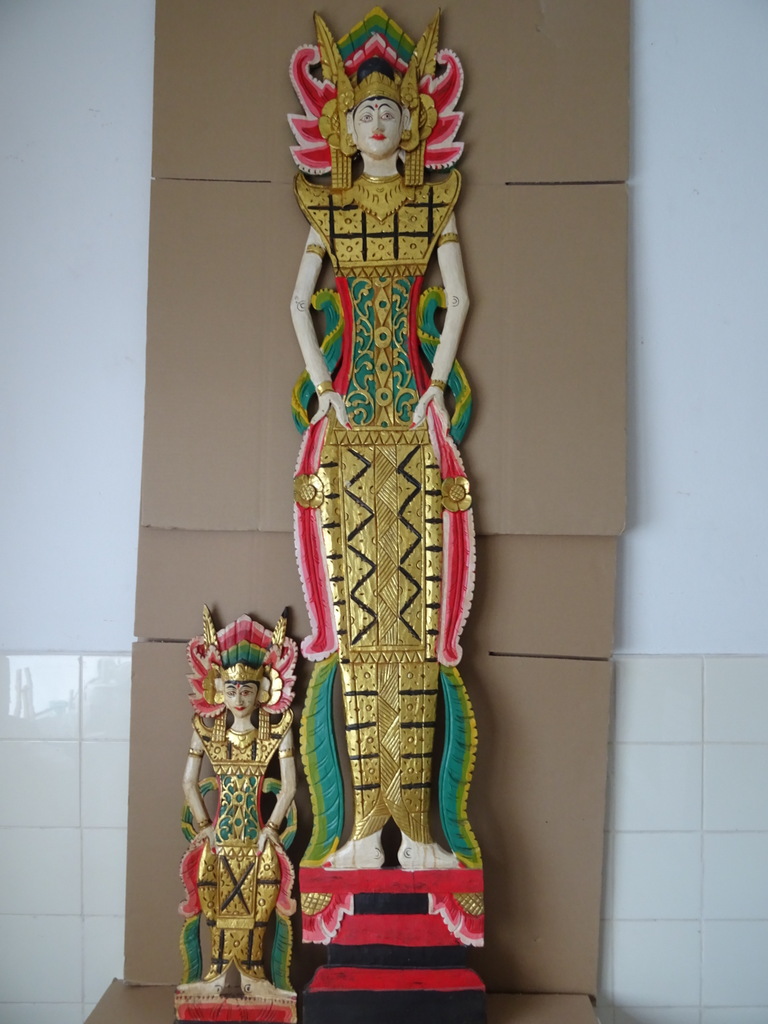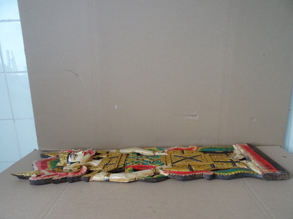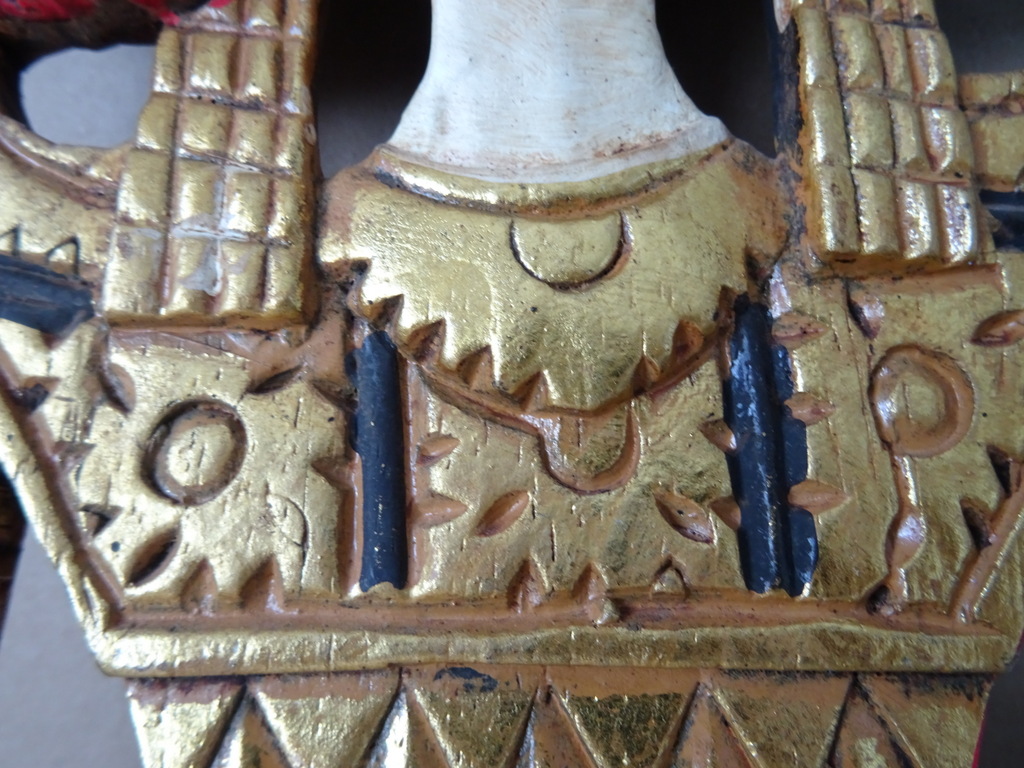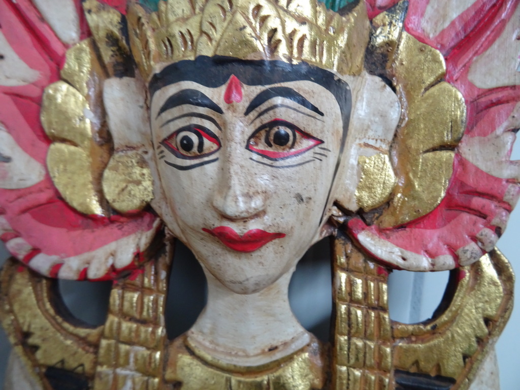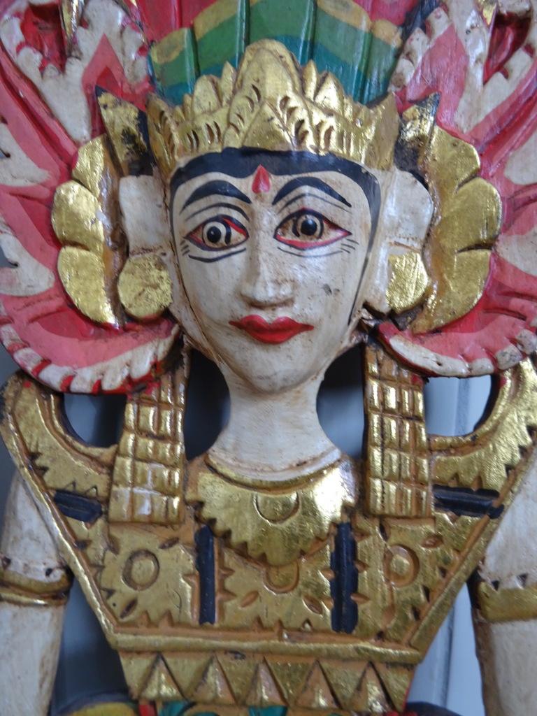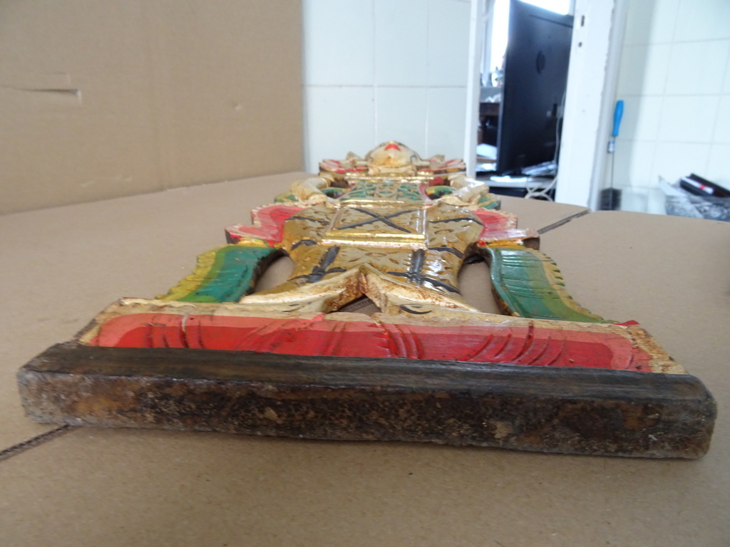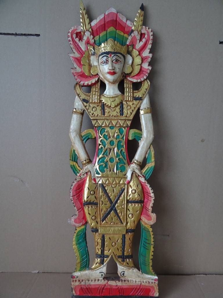 Verguld houtsnijwerk Indonesië Sang Hyang Tunggal 67cm vervaardigd rond 1970 of later. Afgebeeld is mogelijk Sang Hyang Tunggal, de ‘Allerhoogste’ (ook wel Sang Hyang Widhi Wasa, Tintya of Acintya genoemd) die zich op verschillende wijzen manifesteert. Hierin is de drie-eenheid verenigd; Brahma de schepper, Vishnu de beschermer en Shiva de vernietiger. Ik ben hier nog niet helemaal zeker van, tips zijn altijd welkom. Het houtsnijwerk is in een schitterende gebruikte staat, haast puntgaaf. Aan de bovenzijde missen slechts twee chipjes, een aan de achterkant en een aan de voorkant, zie foto’s. Dit zal gekomen zijn door de werking van het hout. De laklaag is nog mooi intact en het paneel is rijkelijk verguld, zie foto’s. Op de laatste foto ziet u het stuk afgebeeld naast eenzelfde houtsnijwerk van 169 cm.