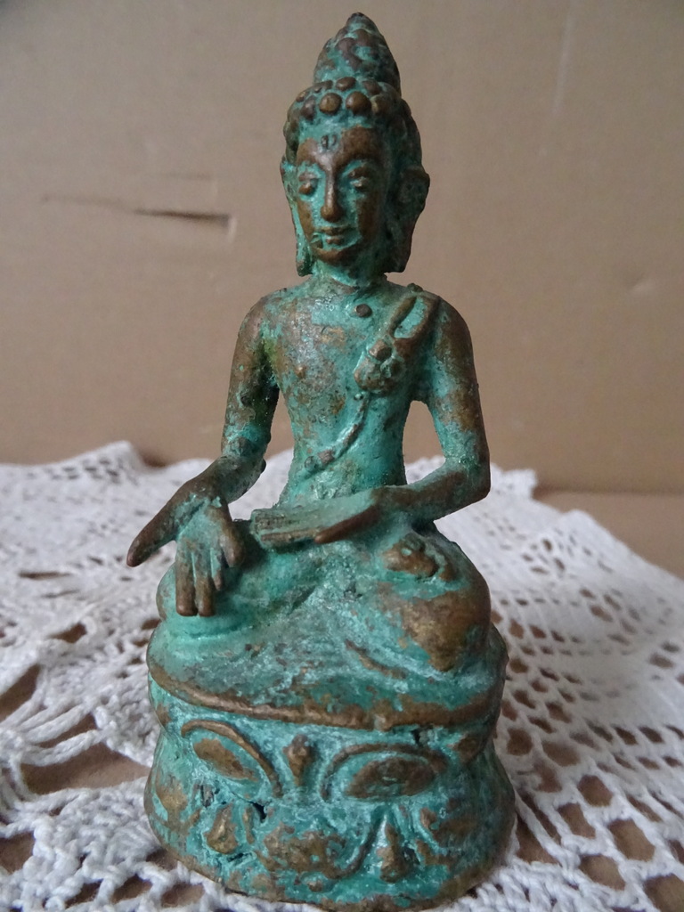 Vintage Bronzen Boeddhabeeld 9cm vervaardigd rond 1950 of later. Afgebeeld een zittende Boeddha die een gebaar maakt met zijn handen. Het beeld is in nog vrij goede staat. Verrijk uw interieur met dit prachtige beeld of geef het iemand cadeau! Mogelijk afkomstig uit Thailand.