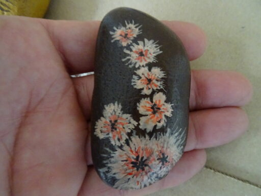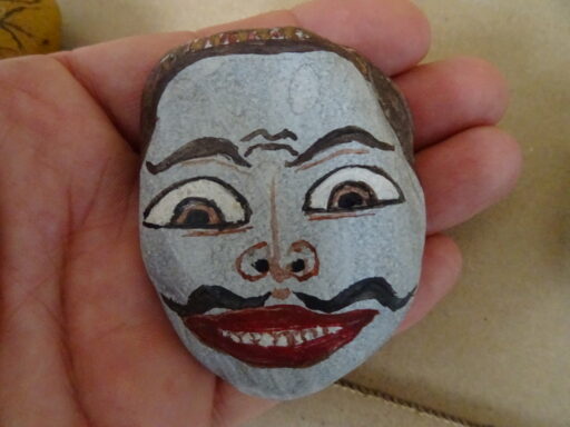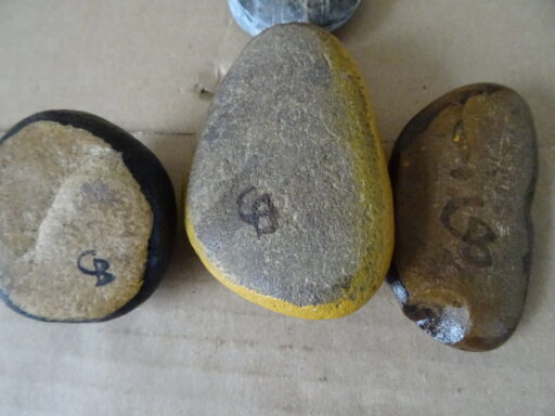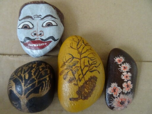 Collectie beschilderde stenen beschilderd rond 1970 of later. Drie van de vier stenen zijn gesigneerd; CB. De steen waarop een Aziatisch masker is geschilderd niet, zie foto’s. De afmetingen van deze steen zijn circa 5 bij 6,5 bij 2 cm. Afmetingen gele steen circa 5 bij 8,5 bij 3 cm.