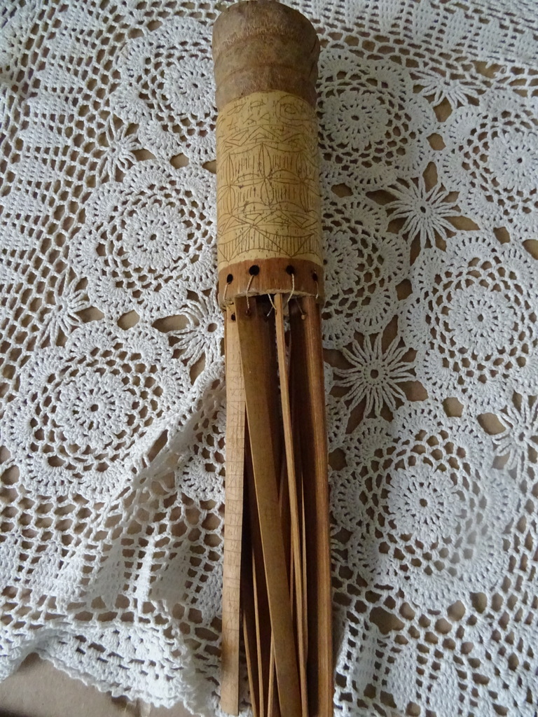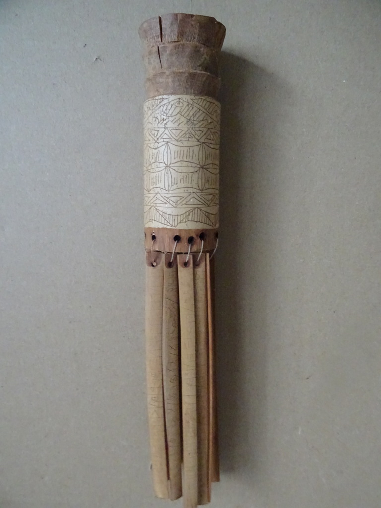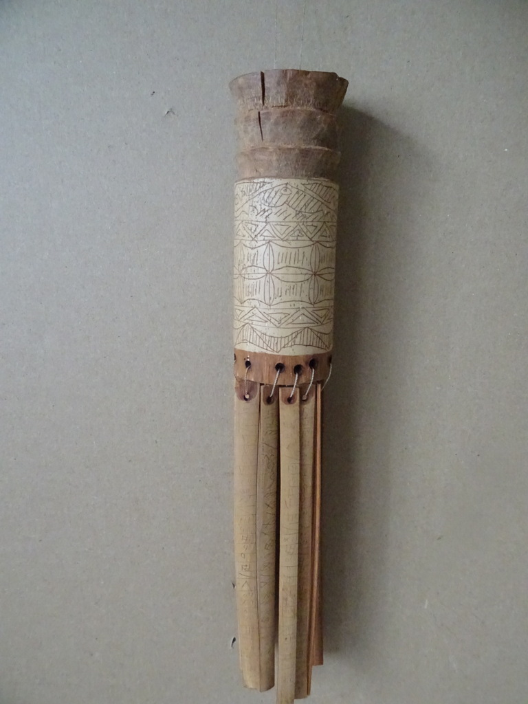 Pustaha kalender Batak Sumatra 26cm vervaardigd rond 1960 of later. Dit soort kalender gebruikt het Batak volk bij het voorspellen van gunstige of ongunstige dagen. Dit wordt gedaan om belangrijke gebeurtenissen te plannen zoals ceremonies en landbouwactiviteiten. Elk van de twaalf bamboe strookjes staat voor 30 dagen.