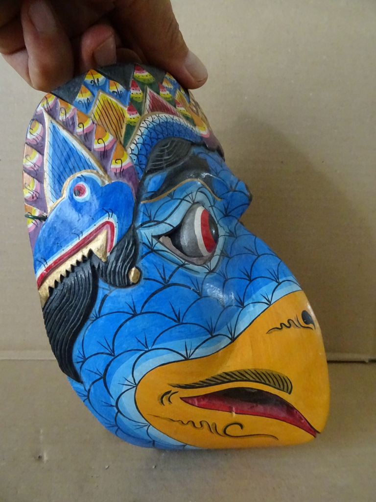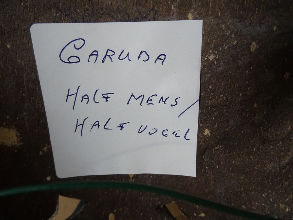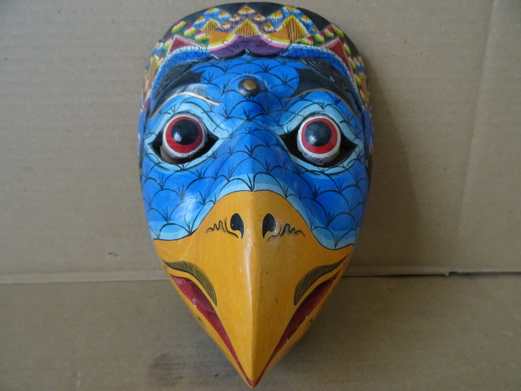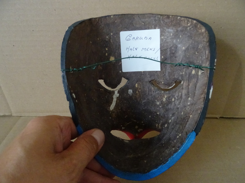 Vintage houten Garuda masker Indonesië vervaardigd rond 1960 of wat later. Het fraaie Balinese masker is met de hand gesneden. Het is in een schitterende gebruikte staat, nog vrij mooi, zie foto’s. Afkomstig uit een collectie. Garuda is een mythisch wezen uit zowel het hindoeïsme als het boeddhisme. Hij is de koning van de vogels, half dier en half mens.