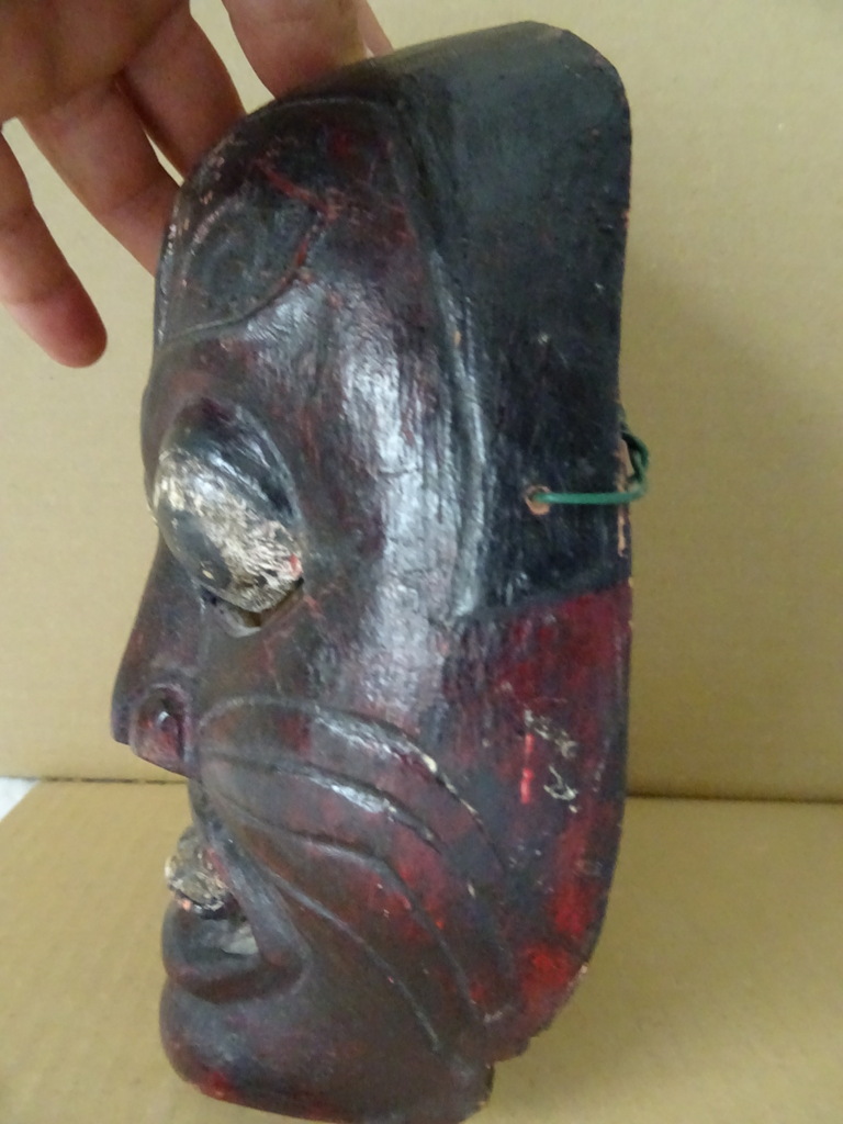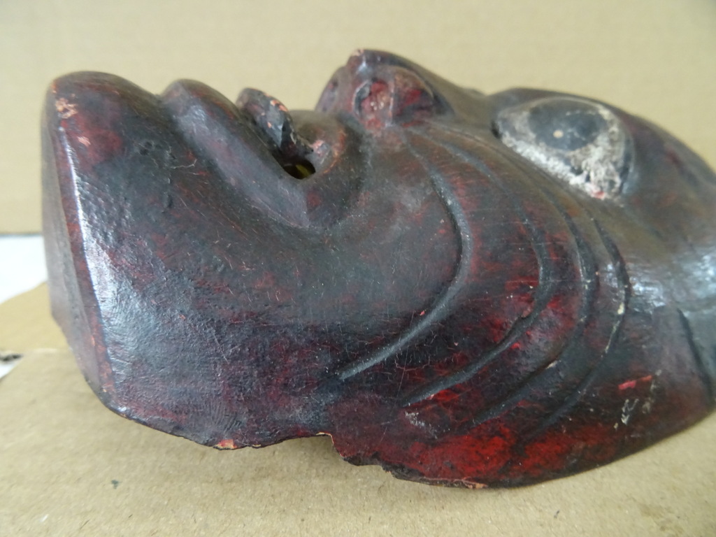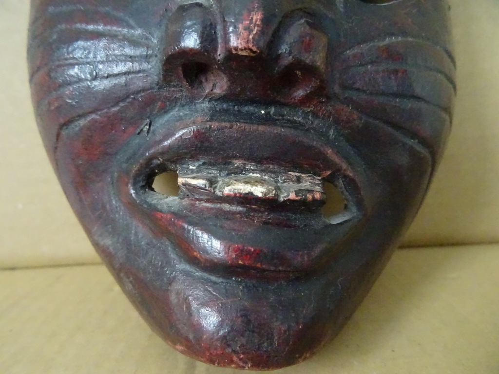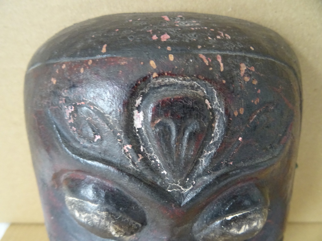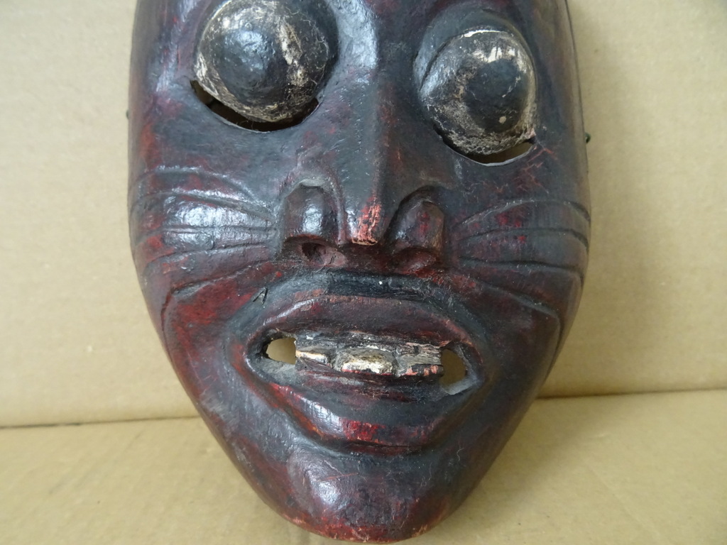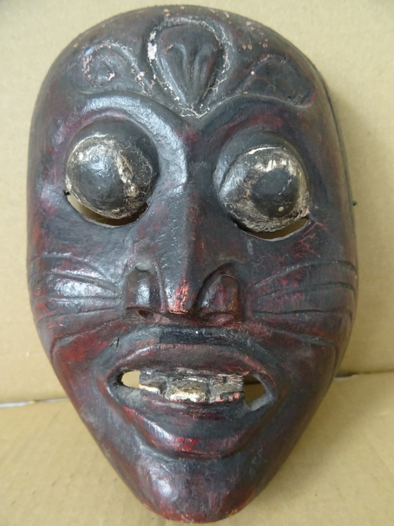 Vintage houten masker Indonesië vervaardigd rond 1960 of wat later. Het fraaie masker is in een schitterende gebruikte staat, zie foto’s. Het mist slechts enkele chipjes aan de rand aan de bovenkant en zijkanten, zie foto’s. Dit is wat bijgewerkt met zwart. Als het ophangt zie je dat niet. Het is afkomstig uit een collectie.