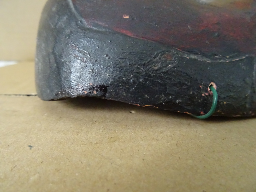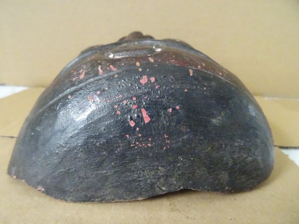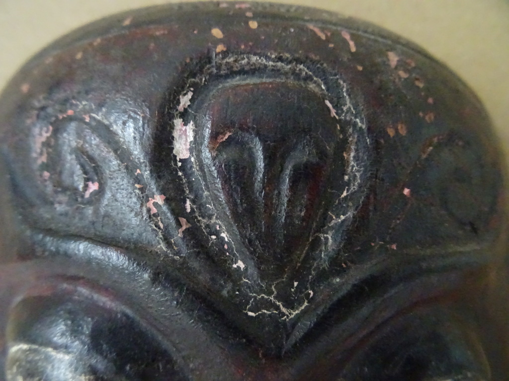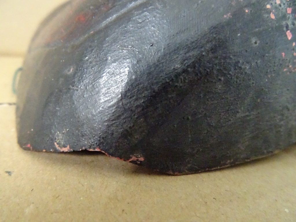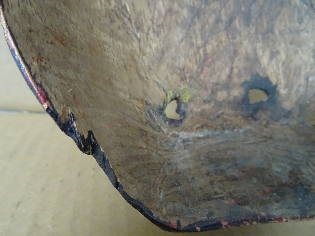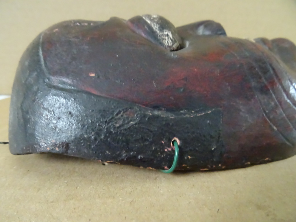 Vintage houten masker Indonesië vervaardigd rond 1960 of wat later. Het fraaie masker is in een schitterende gebruikte staat, zie foto’s. Het mist slechts enkele chipjes aan de rand aan de bovenkant en zijkanten, zie foto’s. Dit is wat bijgewerkt met zwart. Als het ophangt zie je dat niet. Het is afkomstig uit een collectie.