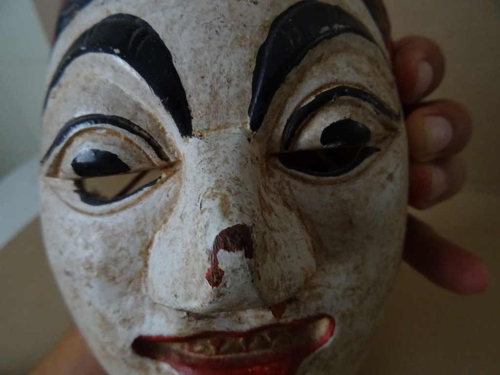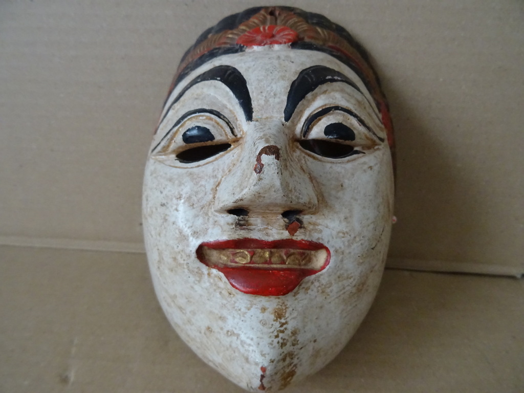 Vintage houten masker Indonesië vervaardigd rond 1960 of wat later. Het fraaie masker is in een schitterende gebruikte staat, zie foto’s. Afkomstig uit een collectie.