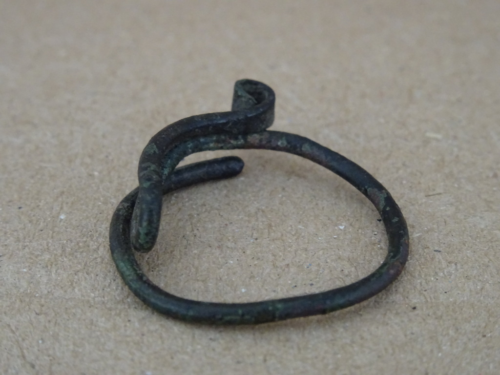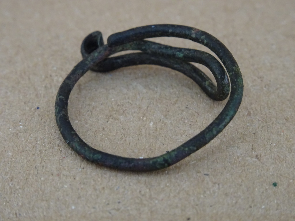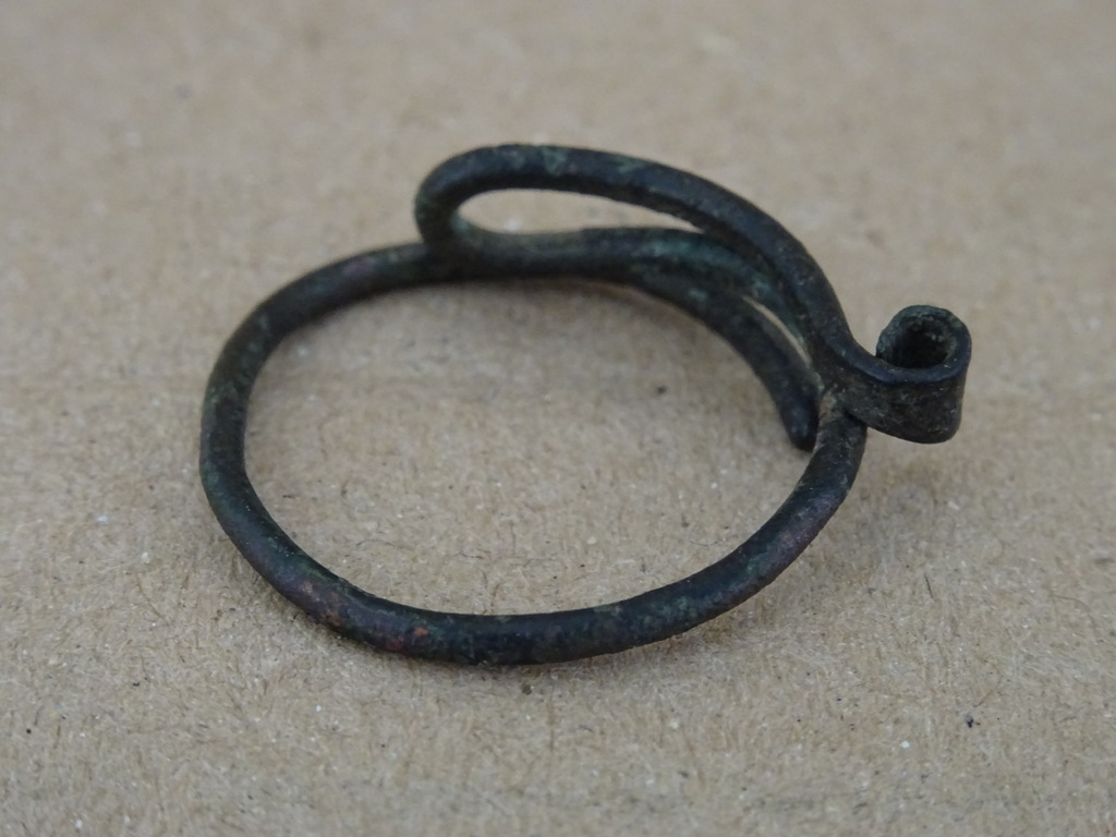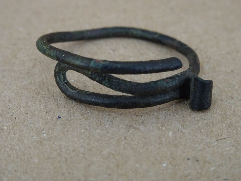 Bodemvondst Keltische ring 400-200 v. Christus gemaakt van koper. De imponerende ring is een waar pronkstuk met aan de voorkant de kenmerkende Keltische spiraalvorm. De ringmaat is 20 mm. Het sieraad is in een prachtige gebruikte staat. Voor een ring die heel lang onder de grond lag ziet hij er nog vrij goed uit. Het lijkt erop dat de ring (ook) als hanger is gebruikt want hij heeft een oogje, zie foto’s. Het oogje is nog intact. Steel de show met dit circa 2300 jaar oude sieraad!