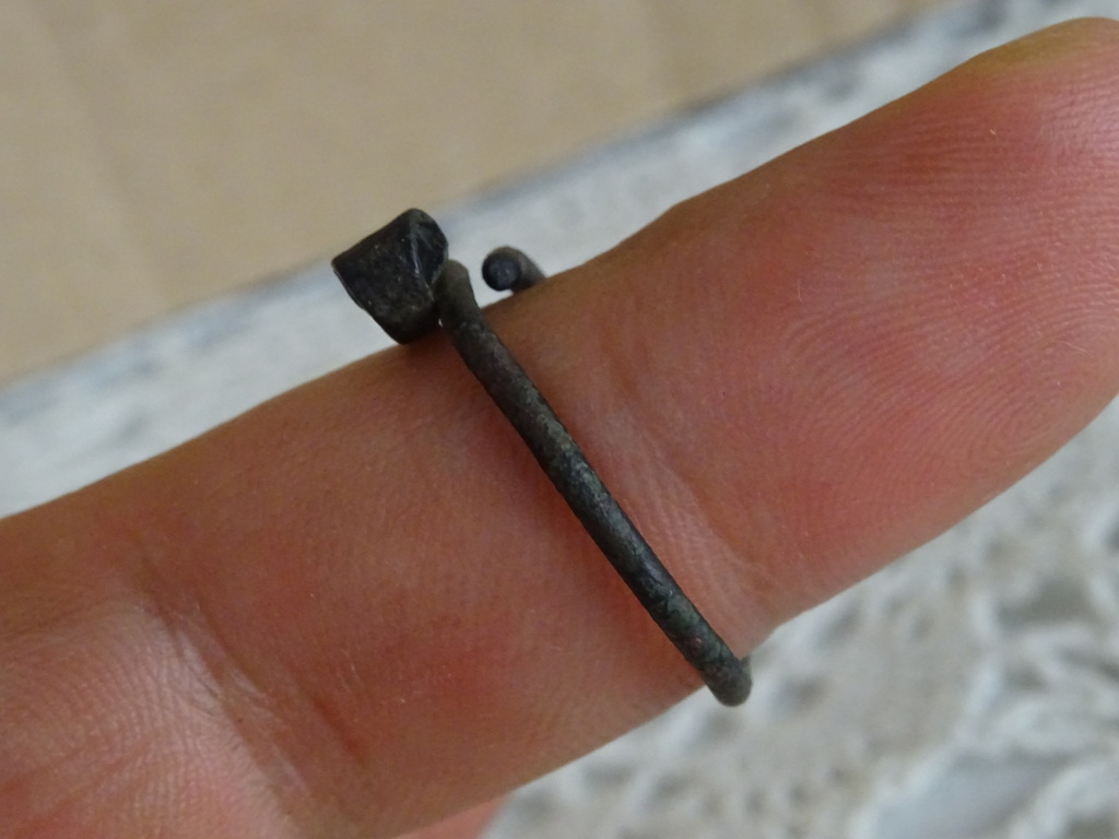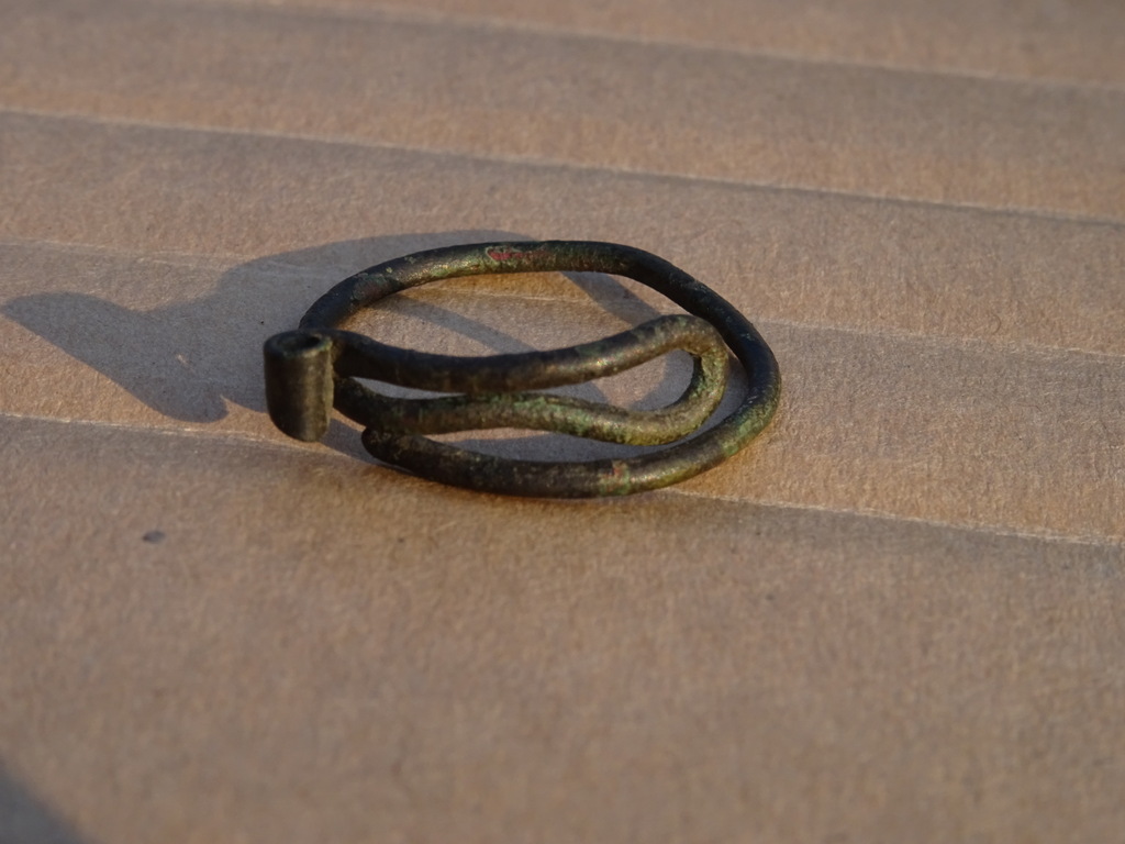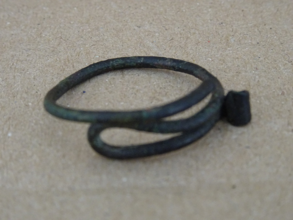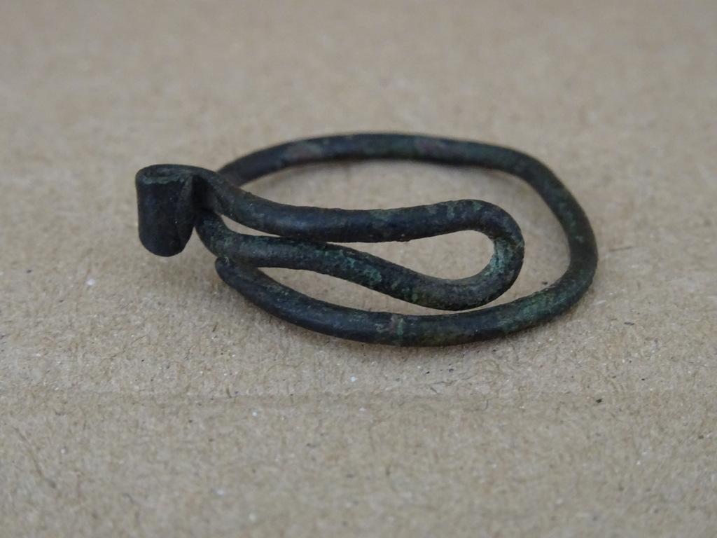 Bodemvondst Keltische ring 400-200 v. Christus gemaakt van koper. De imponerende ring is een waar pronkstuk met aan de voorkant de kenmerkende Keltische spiraalvorm. De ringmaat is 20 mm. Het sieraad is in een prachtige gebruikte staat. Voor een ring die heel lang onder de grond lag ziet hij er nog vrij goed uit. Het lijkt erop dat de ring (ook) als hanger is gebruikt want hij heeft een oogje, zie foto’s. Het oogje is nog intact. Steel de show met dit circa 2300 jaar oude sieraad!