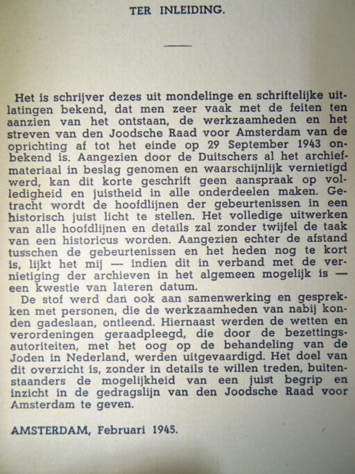 Joodsche raad voor Amsterdam door Mr. K. P. L. Berkley oftewel overzicht van het ontstaan, de werkzaamheden en het streven van den Joodsche raad voor Amsterdam door Mr. K. P. L. Berkley uit 1945. Het boek telt 101 bladzijdes en is in redelijke staat, zie foto`s. Het kaft blad ontbreekt.