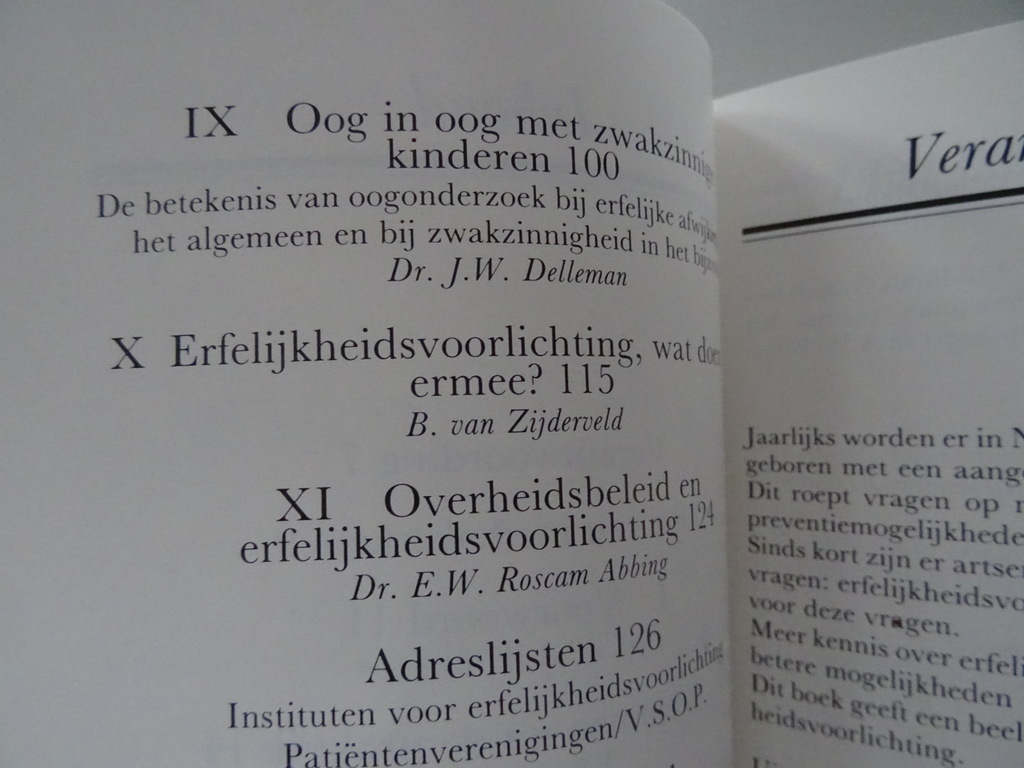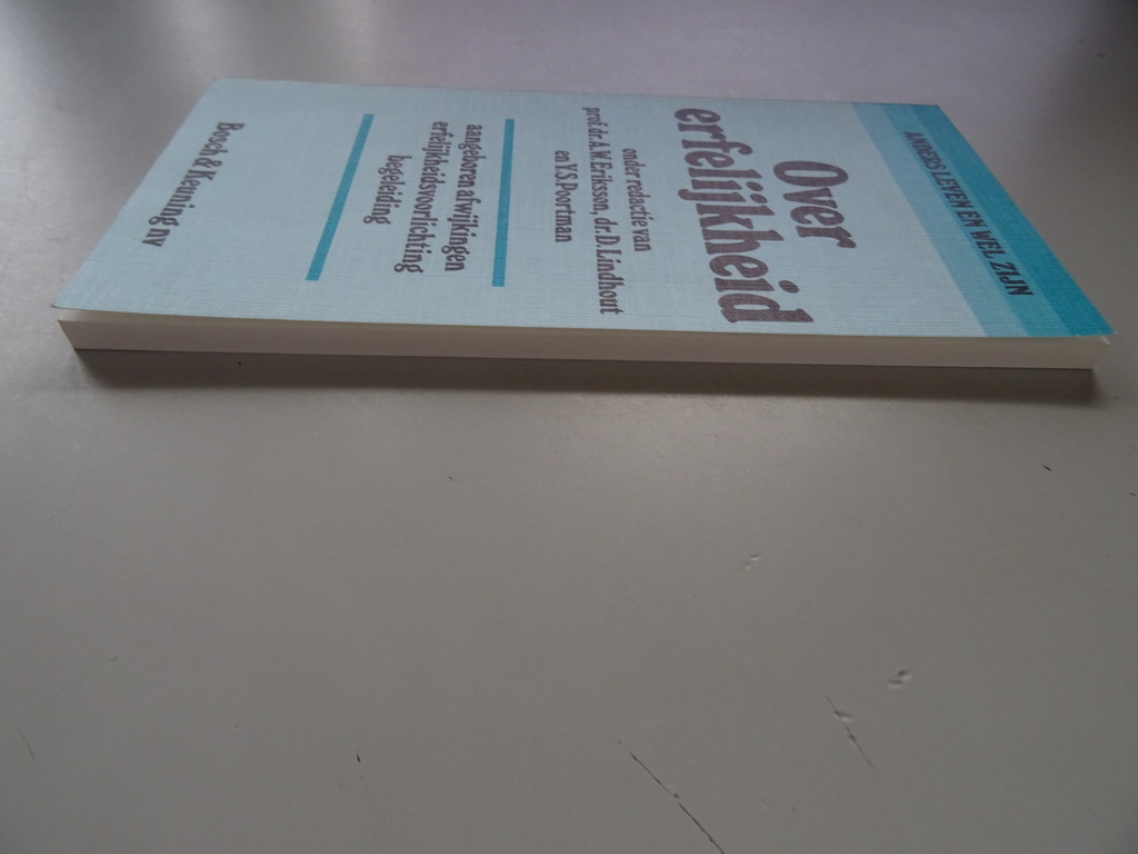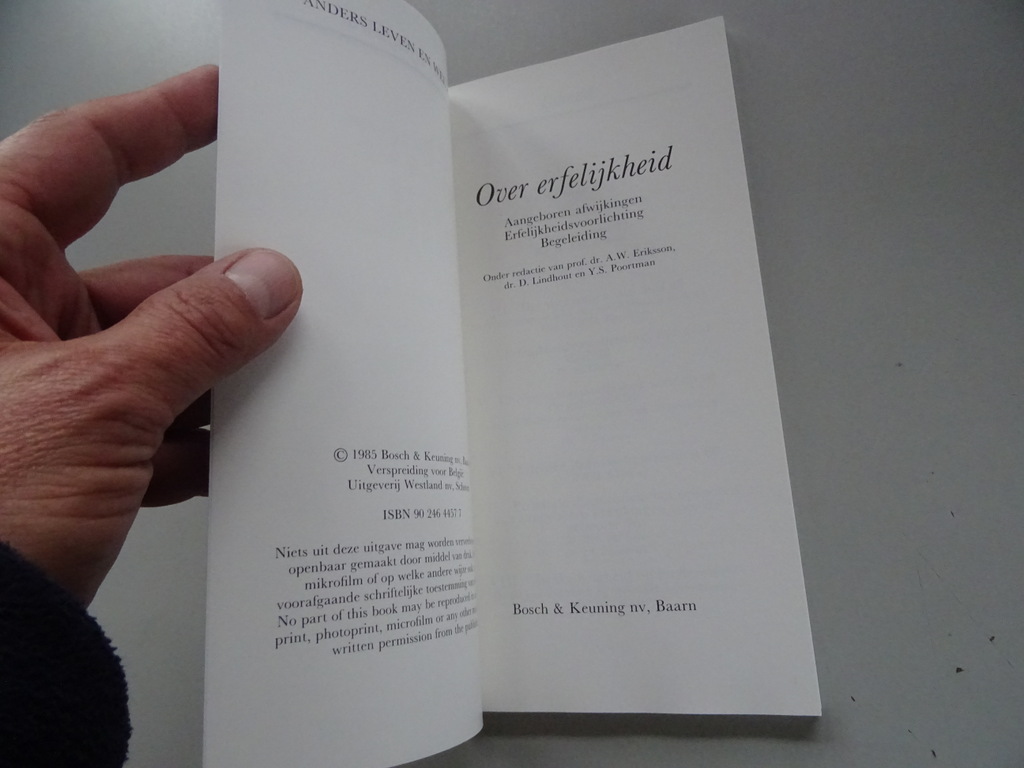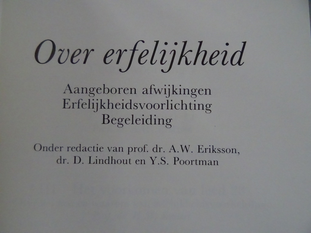 A. W. Eriksson D. Lindhout en Y. S. Poortman Over erfelijkheid, Aangeboren afwijkingen, Erfelijkheidsvoorlichting, Begeleiding, eerste druk uit 1985. In nog vrij goede staat, als nieuw. Van binnen nog zeer mooi, ongelezen. 142 pagina’s.