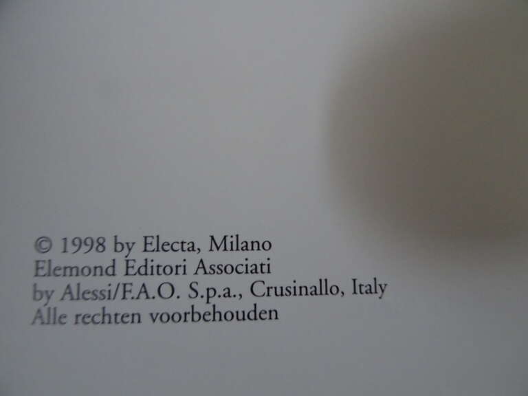 Alberto Alessi De droomfabriek Alessi vanaf 1921, eerste Nederlandse druk uit 1998. In goede gebruikte staat, achterkant kaft heeft slijtageplekje, zie foto’s. Van binnen nog zeer mooi, lijkt ongelezen. 128 pagina’s. Boordevol schitterende foto’s van Alessi designobjecten. Bekijk ook onze Alessi Super G lamp!