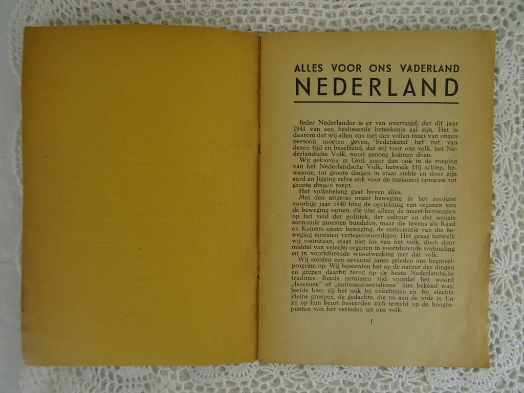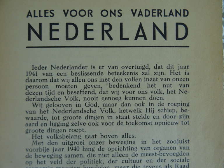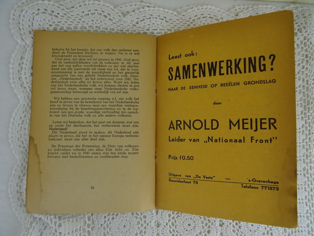 Alles voor ons vaderland Nederland Arnold Meijer een sterkend woord uitgesproken bij den aanvang van 1941. Arnold Meijer was een Nederlandse fascistische politicus ten tijde van de tweede wereldoorlog. Hij was de leider van Zwart Front en tegenhanger van de NSB. Het boekje heeft 16 bladzijdes en is in goede gebruikte staat. Er zijn wat vlekjes door het hele boekje.