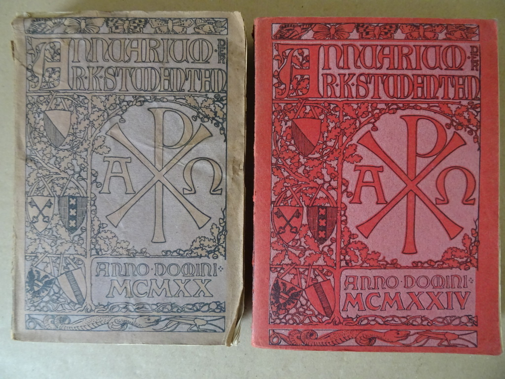 Annuarium R. K. studenten 1920 en 1924 oftewel Annuarium der Roomsch Katholieke studenten in Nederland 1920 en 1924, eerste drukken uit circa 1920 en 1924. Het Annuarium 1920 is in redelijke gebruikte staat, licht beschadigd, vouwtjes en fragiele kaft, zie foto’s. Van binnen nog best net, ongelezen of weinig gelezen. Het Annuarium 1924 is in een prachtige gebruikte staat, zie foto’s. Van binnen nog best net, enkele lichte leessporen, lijkt weinig gelezen. 364 en 382 pagina’s. Vrij zeldzame boeken.