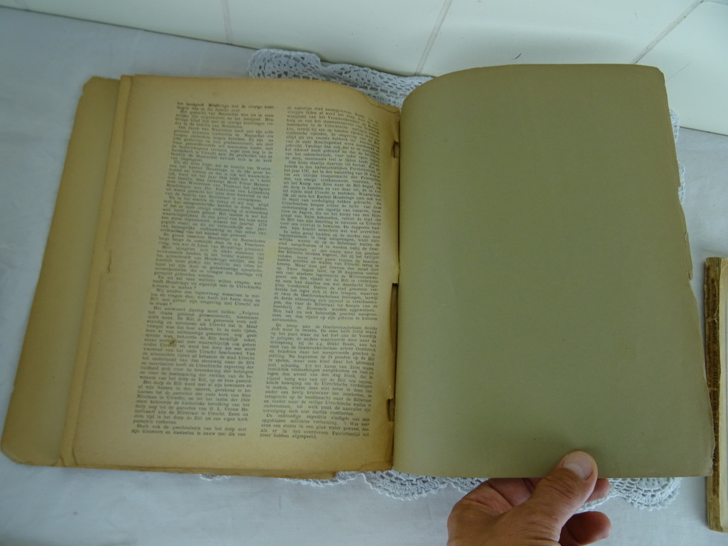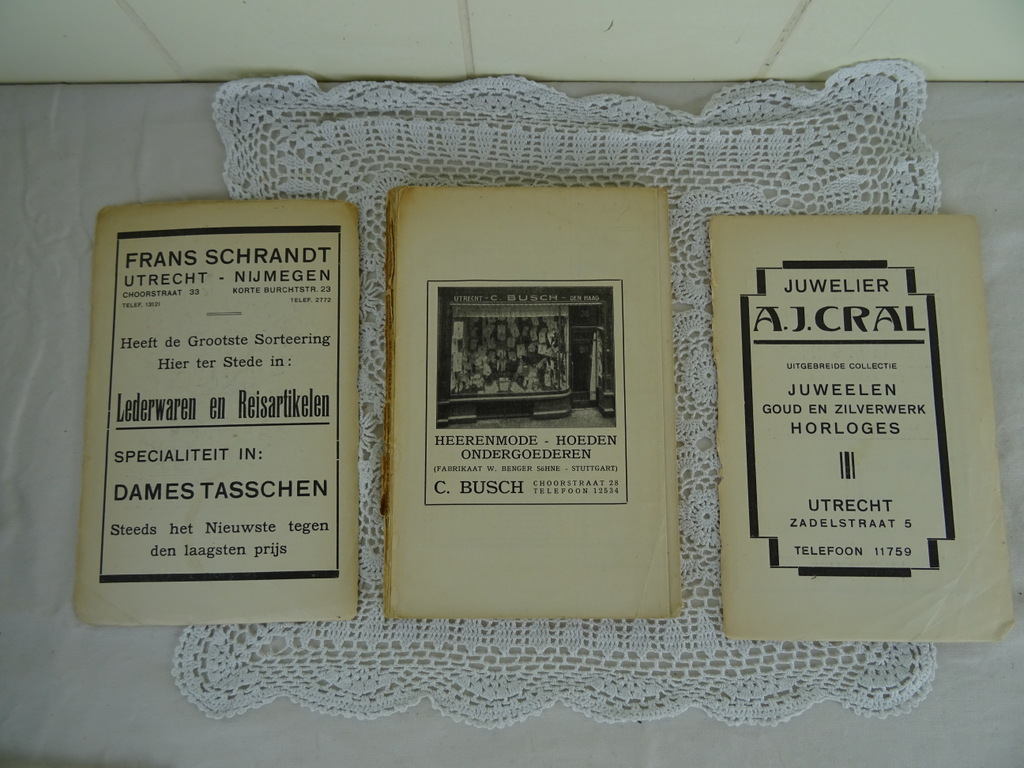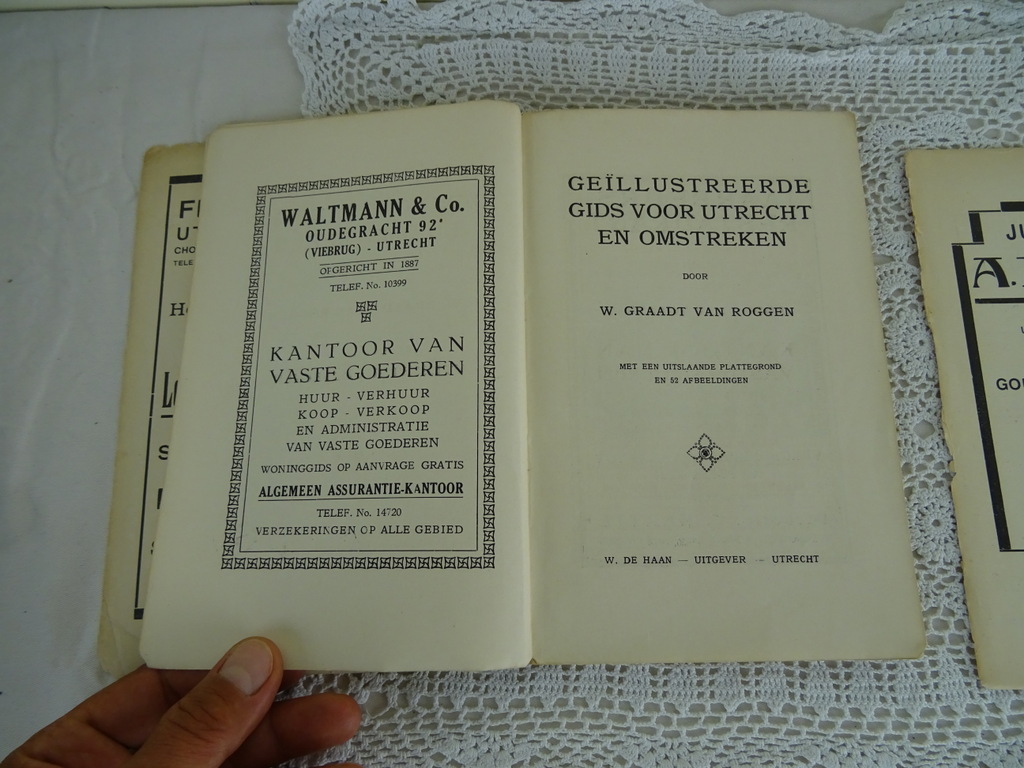 Antieke boeken Utrecht uit circa 1930. U bent een echte Utrechtenaar in hart en nieren? Dan zullen deze boeken u wellicht plezieren. De boeken zijn verrijkt met schitterende foto’s, prenten, advertenties en zelfs tramlijnen! De kaften van de boeken zijn los, dwz die van het kleine boek is voor en achter los en de voorkaft van het grote boek ging los tijdens het fotograferen. Van binnen zijn de boeken nog vrij goed. Dus, plakbandje erop en genieten maar!