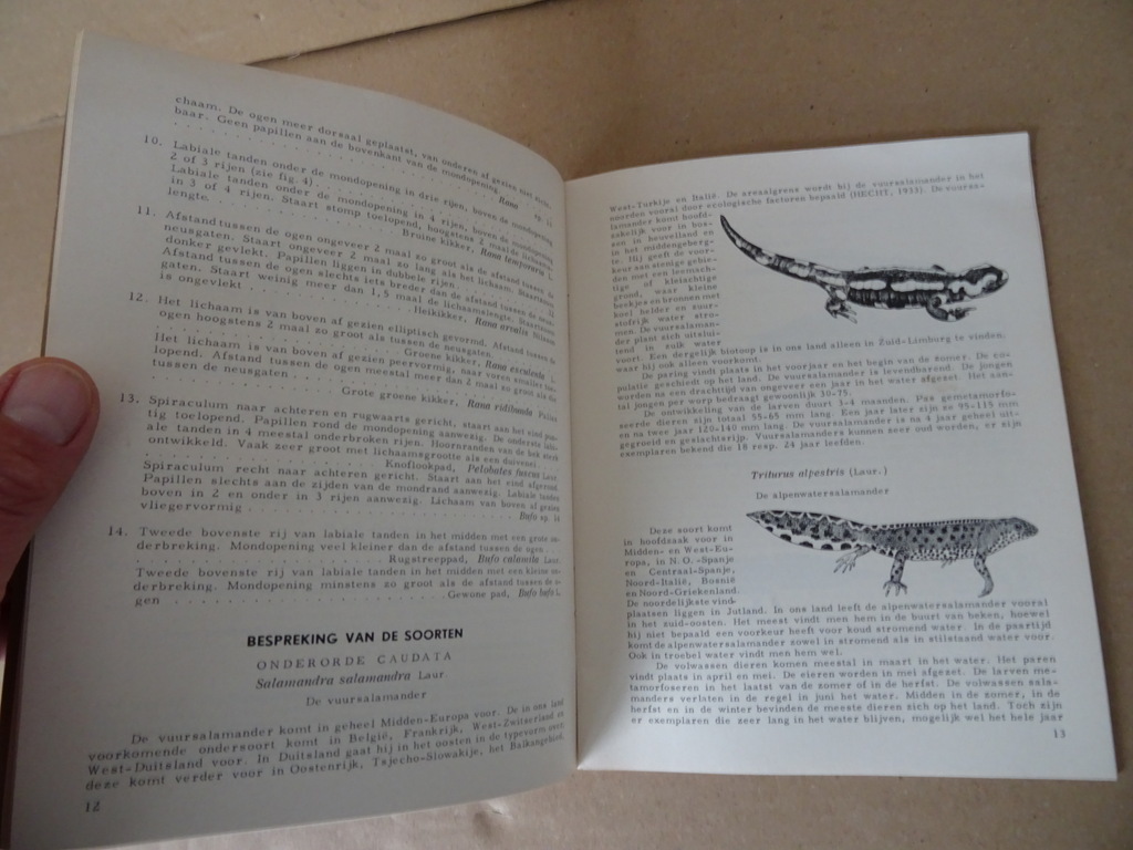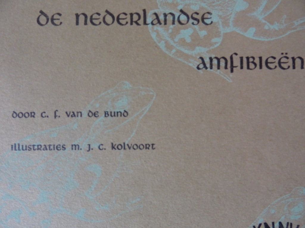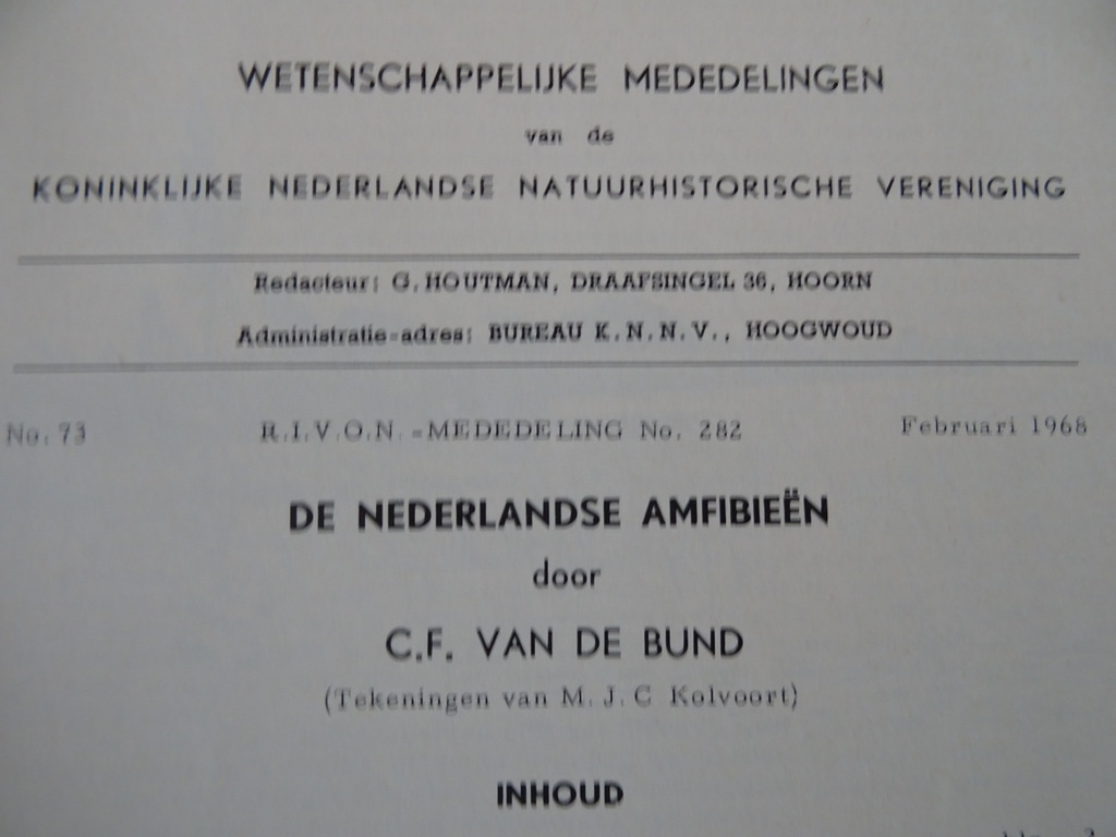 C. F. van de Bund De Nederlandse amfibieën, illustraties M. J. C. Kolvoort, Wetenschappelijke mededeling no. 73, februari 1968, eerste druk uit 1968. In goede gebruikte staat, licht gevouwen, zie foto’s. Van binnen afgezien daarvan nog mooi, lijkt ongelezen. 32 pagina’s.