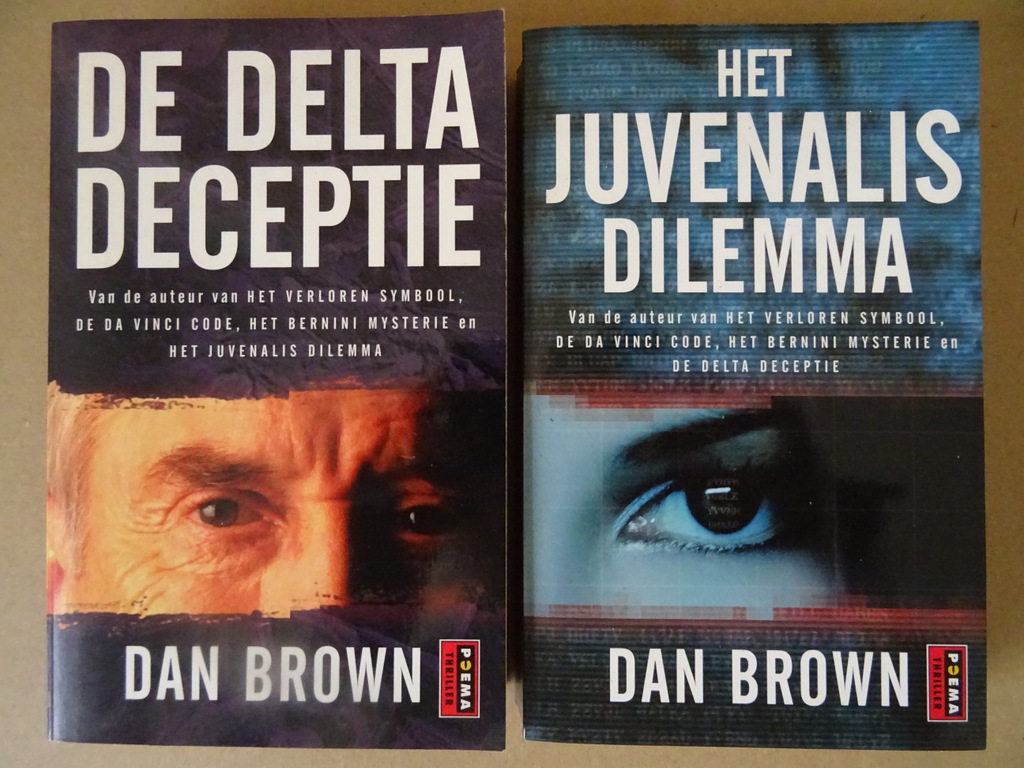 Dan Brown De Delta deceptie Het juvenalis dilemma, vijftiende en tweeëndertigste druk uit 2009. De set is in een schitterende gebruikte staat, zie foto’s. Van binnen nog mooi, de boeken lijken ongelezen. 414 en 365 pagina’s.