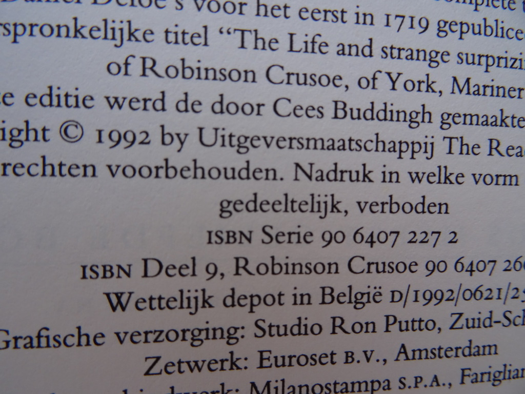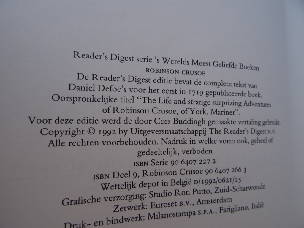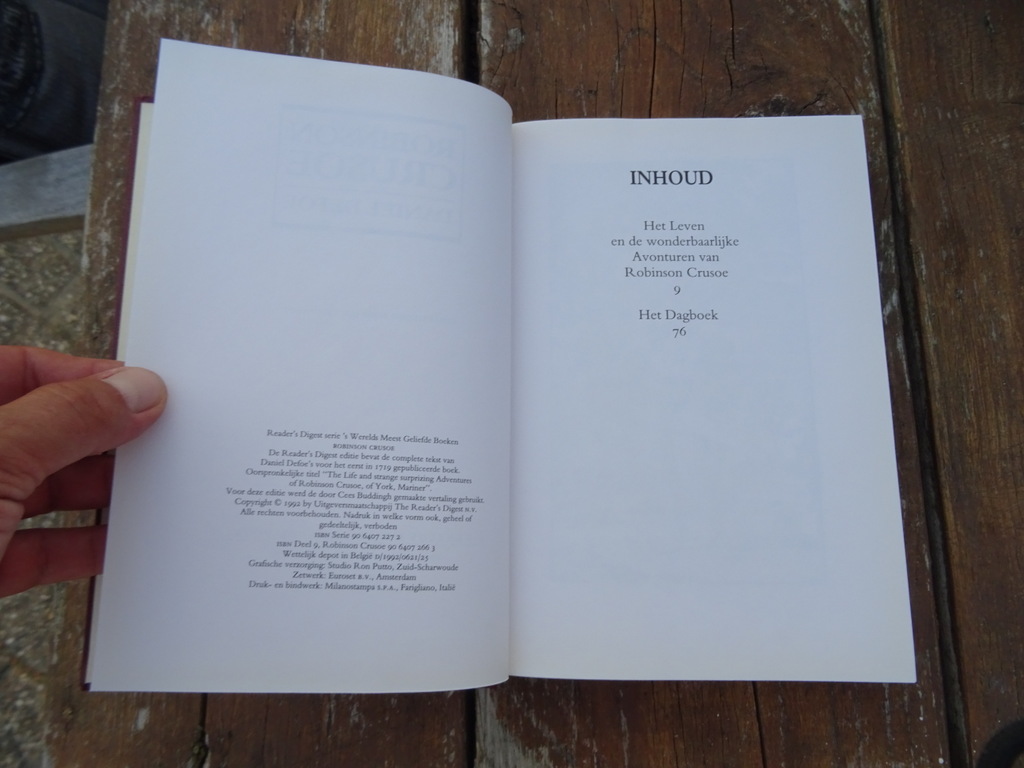 Daniel Defoe Robinson Crusoe uit 1992. Uitgegeven door The Reader’s Digest. Het boek is in goede staat, van binnen nog mooi, ongelezen. 302 pagina’s. Afhalen 5 euro.