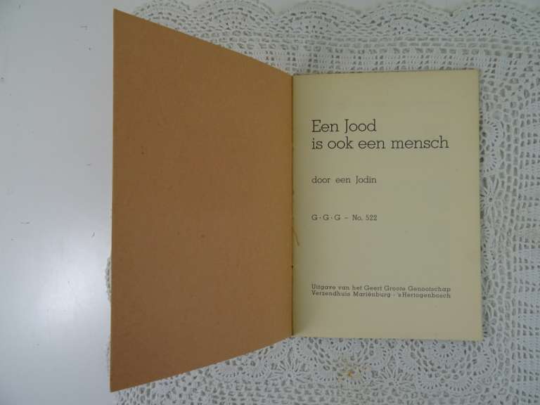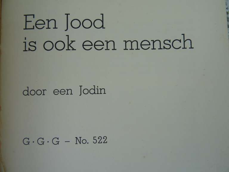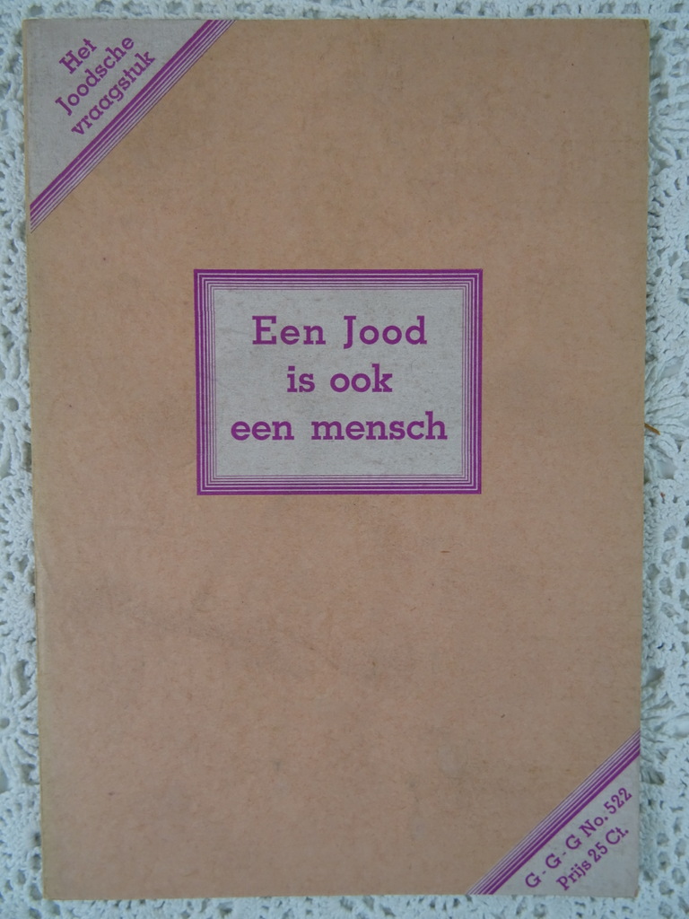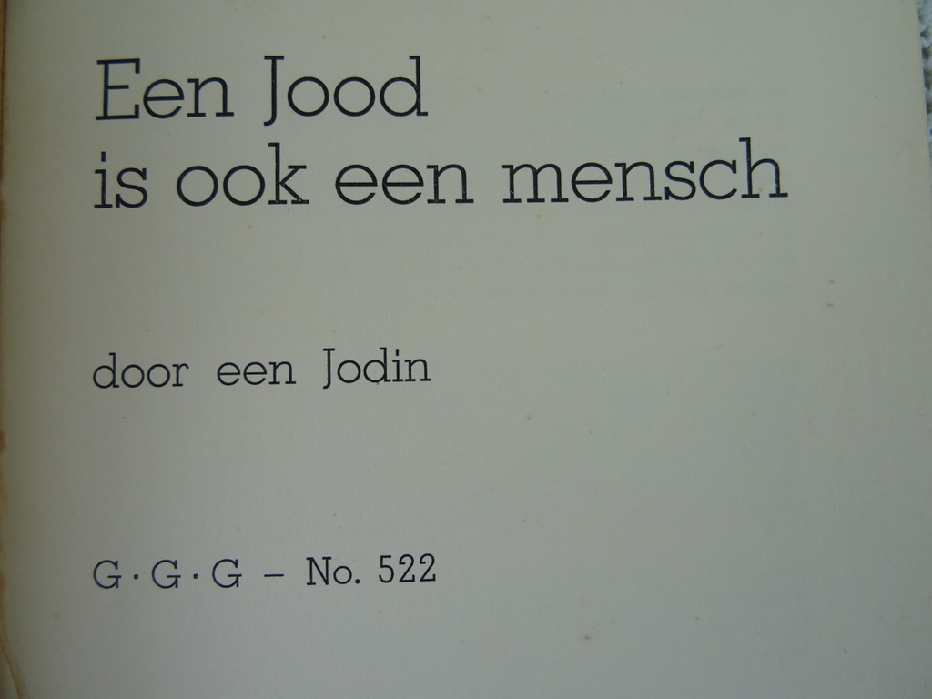 Een Jood is ook een mensch G-G-G No 522 een boekje uit 1936 geschreven door een Jodin. Het boekje telt 28 bladzijdes, het is haast als nieuw.