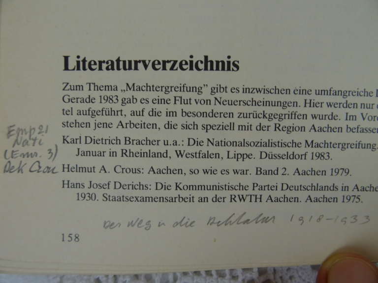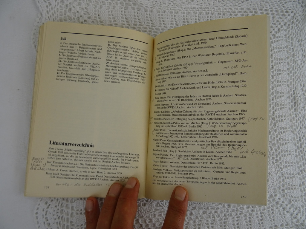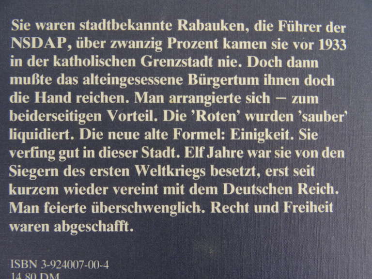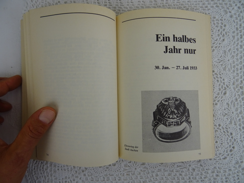 Einigkeit statt recht und freiheit Aachen 1933 een duits boek (1e druk) dat werd uitgebracht in 1983. Het is geschreven door Albert Kirschgens en Gerd spelsberg. Het boek is in goede staat, haast als nieuw, afgezien van de naam die geschreven is voorin. Op de laatste twee pagina’s staan enkele aantekeningen met potlood. Het boek heeft 160 bladzijdes en bevat veel informatie en intrigerende foto’s. Ook zijn er een groot aantal foto’s van krantenkoppen en krantenartikelen die propaganda bevatten.