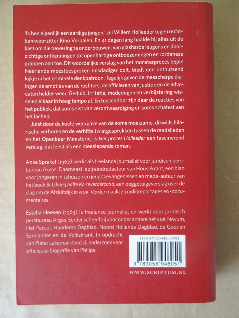 Estella Heesen & Anke Sprakel Het proces Holleeder, Verslag van dag tot dag uit De Bunker, eerste druk uit 2008. In een prachtige gebruikte staat, zie foto’s. Van binnen nog best mooi, lijkt haast ongelezen. 326 pagina’s.