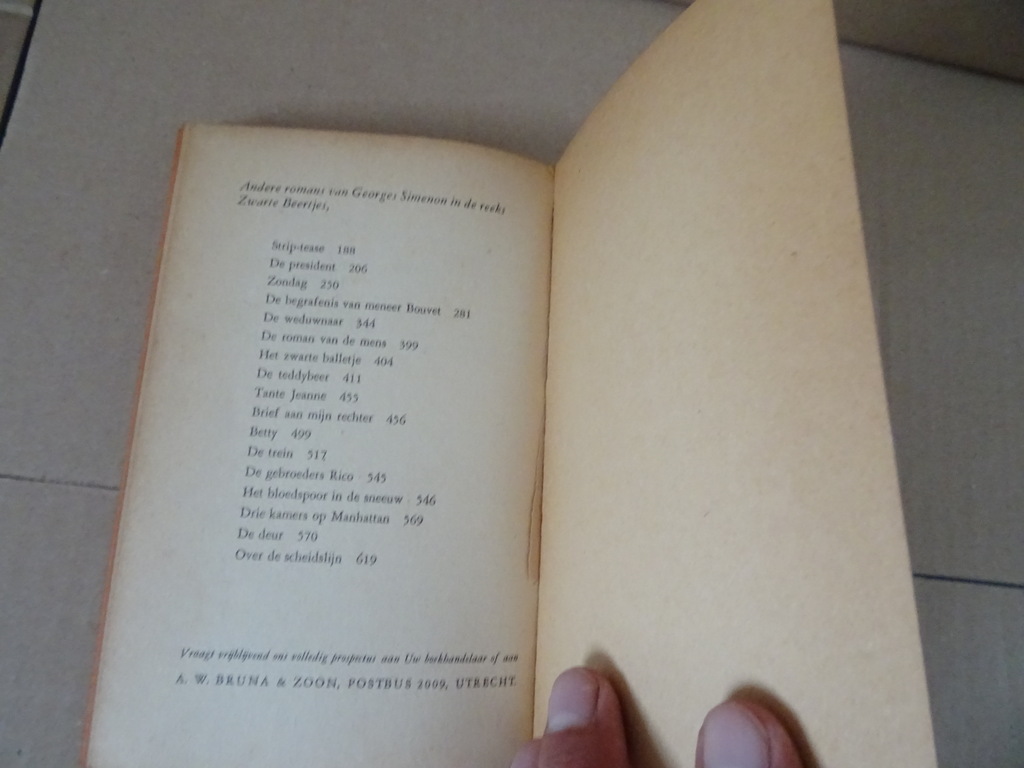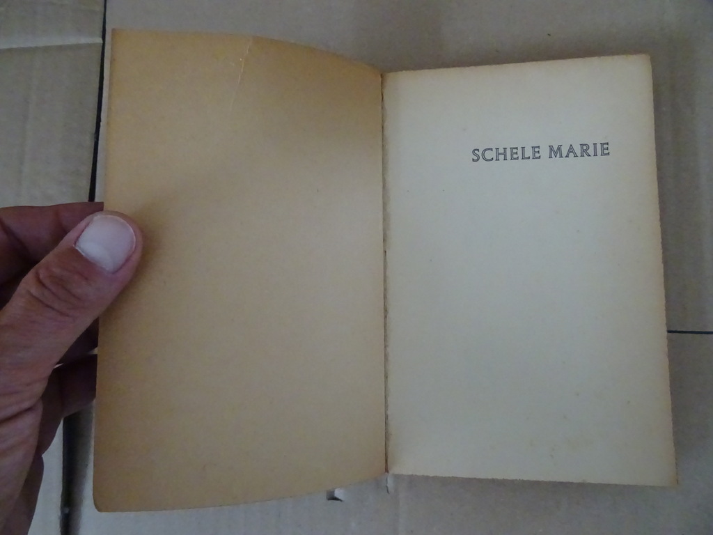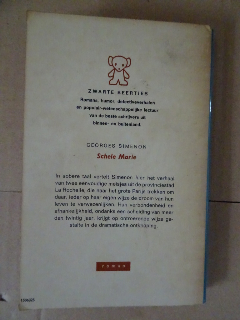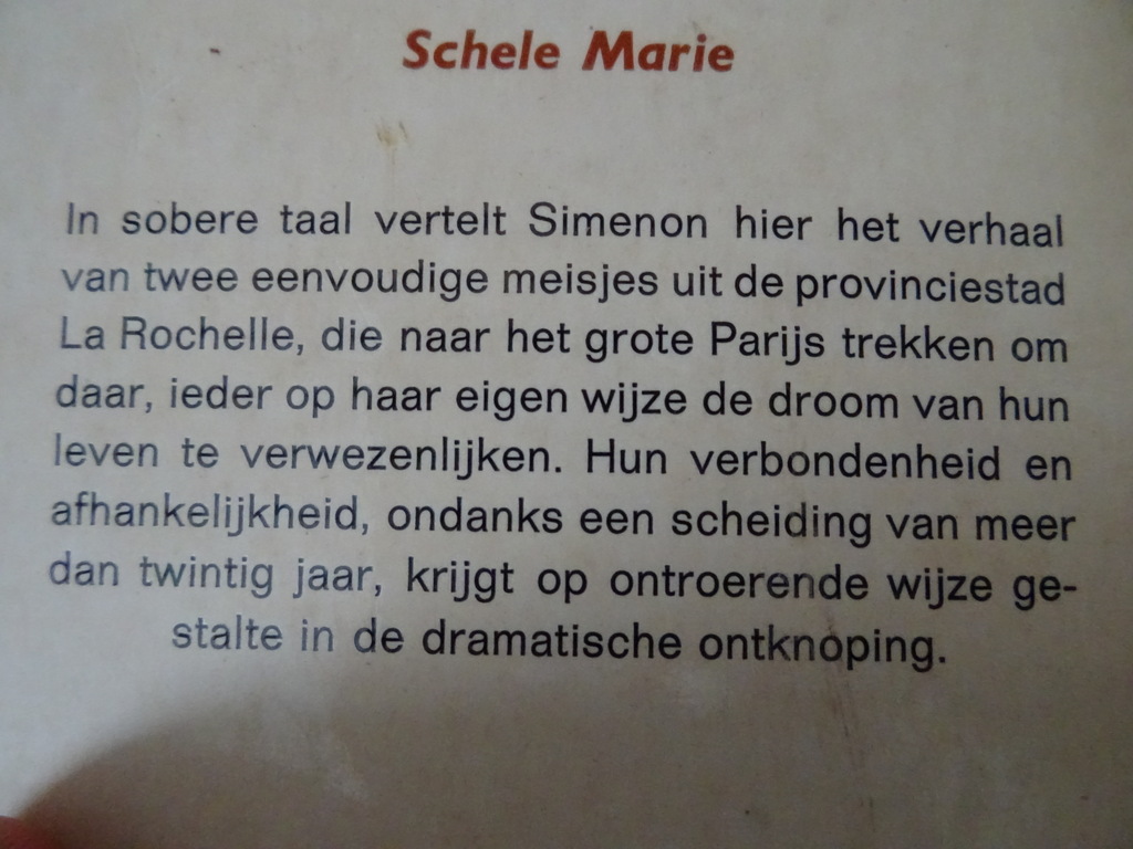 Georges Simenon Schele Marie, mogelijk eerste (Nederlandse) druk uit 1963. Pocketboek in goede gebruikte staat, gelezen en flink verkleurd maar van binnen nog vrij goed afgezien alle gevouwen hoeken. 191 Bladzijdes. Georges Simenon (1903-1989) was een bekende Franstalige Belgische schrijver. Inhoud; In sobere taal vertelt Simenon hier het verhaal van twee eenvoudige meisjes uit de provinciestad La Rochelle. Ze trekken naar het grote Parijs om daar, ieder op haar eigen wijze, de droom van hun even te verwezenlijken. Hun verbondenheid en afhankelijkheid, ondanks een scheiding van meer dan twintig jaar, krijgt op ontroerende wijze gestalte in de dramatische ontknoping.