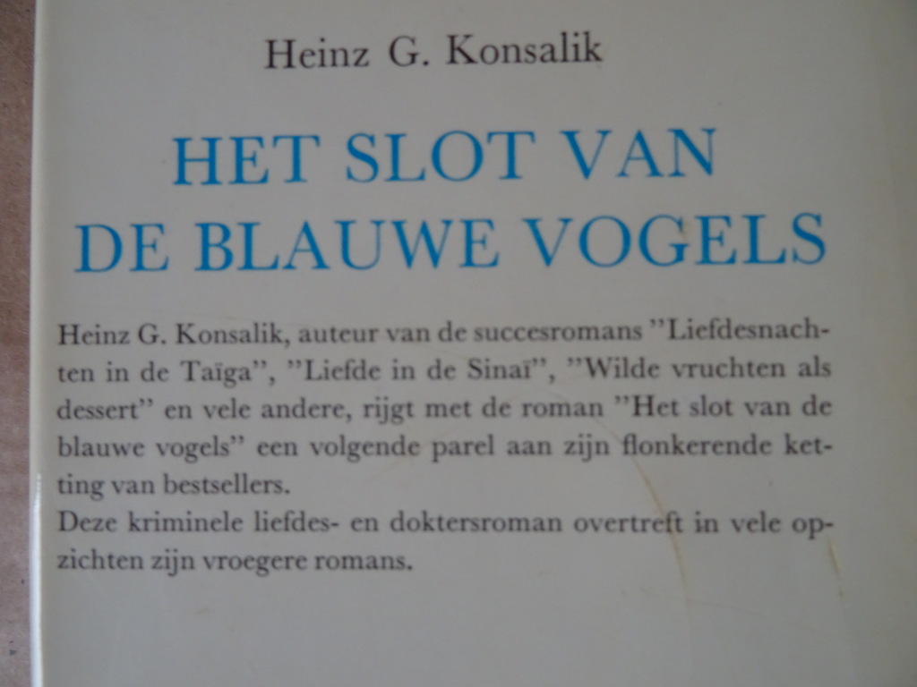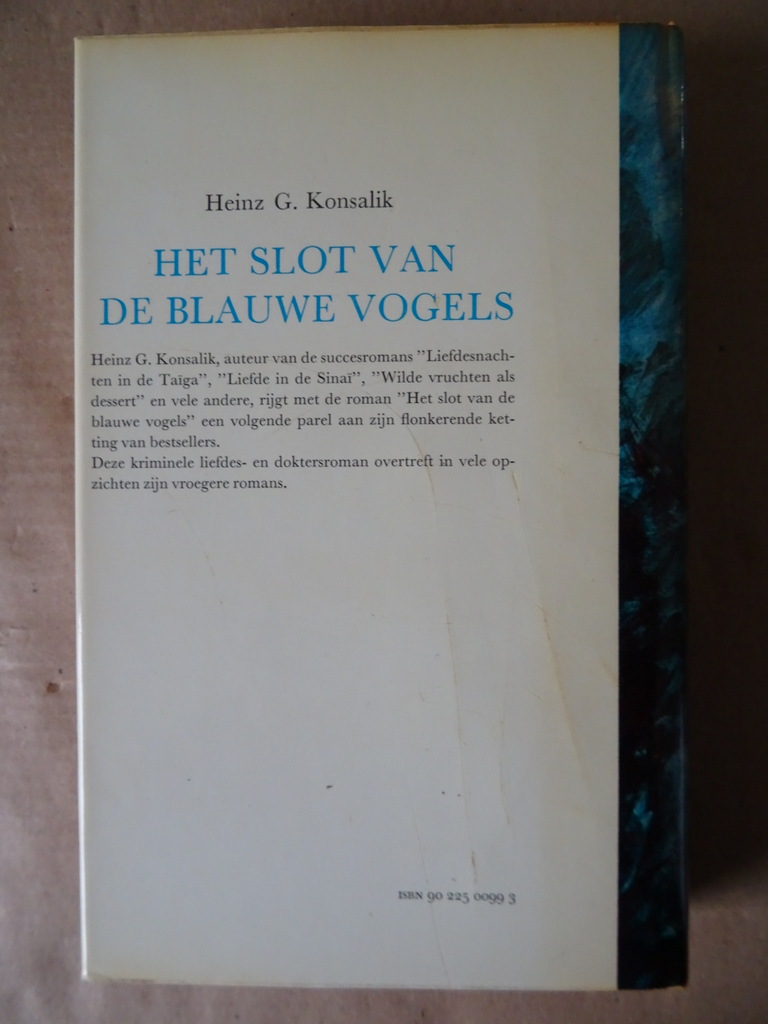 Heinz G. Konsalik Het slot van de blauwe vogels, Roman, tiende Nederlandse druk uit 1968 of later. In schitterende gebruikte staat, zie foto’s. Van binnen nog mooi, lijkt ongelezen. 304 pagina’s.
