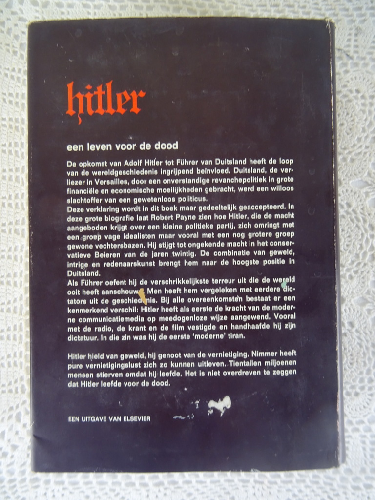 Hitler Een leven voor de dood Robert Payne uit 1974. Het bekroonde boek is in goede staat en heeft 495 bladzijdes. Het is verrijkt met een groot aantal foto’s. Het is een biografie over Adolf Hitler. Het boek is nog in vrij goede staat, van binnen haast als nieuw.