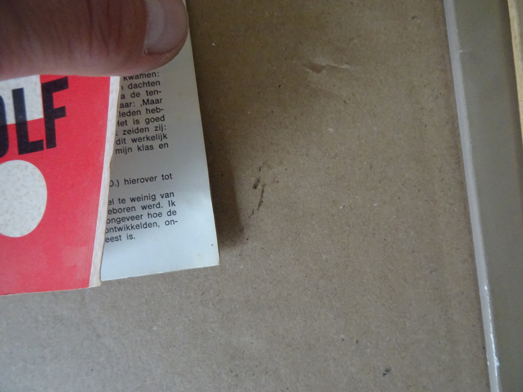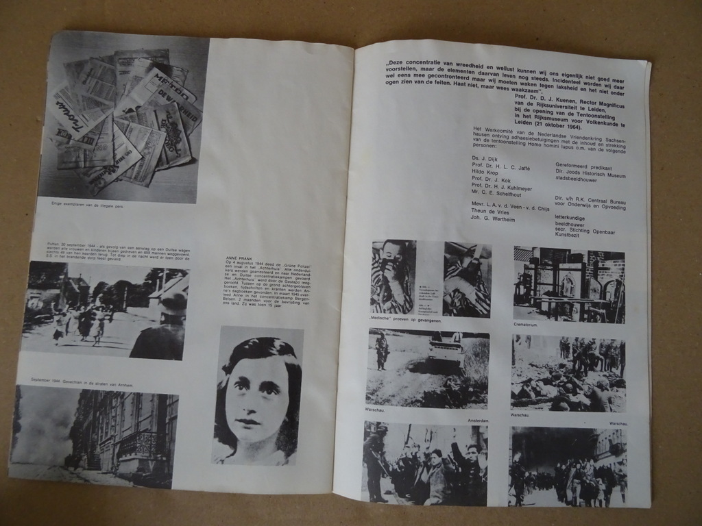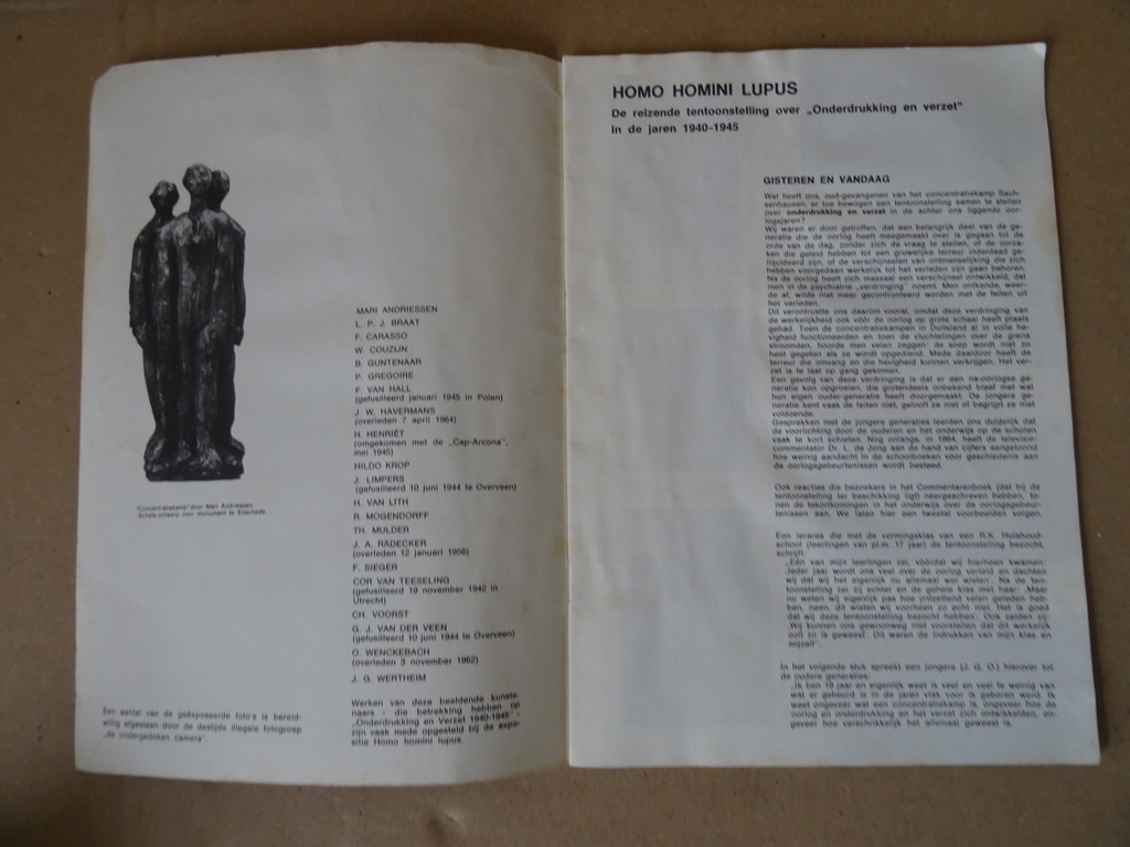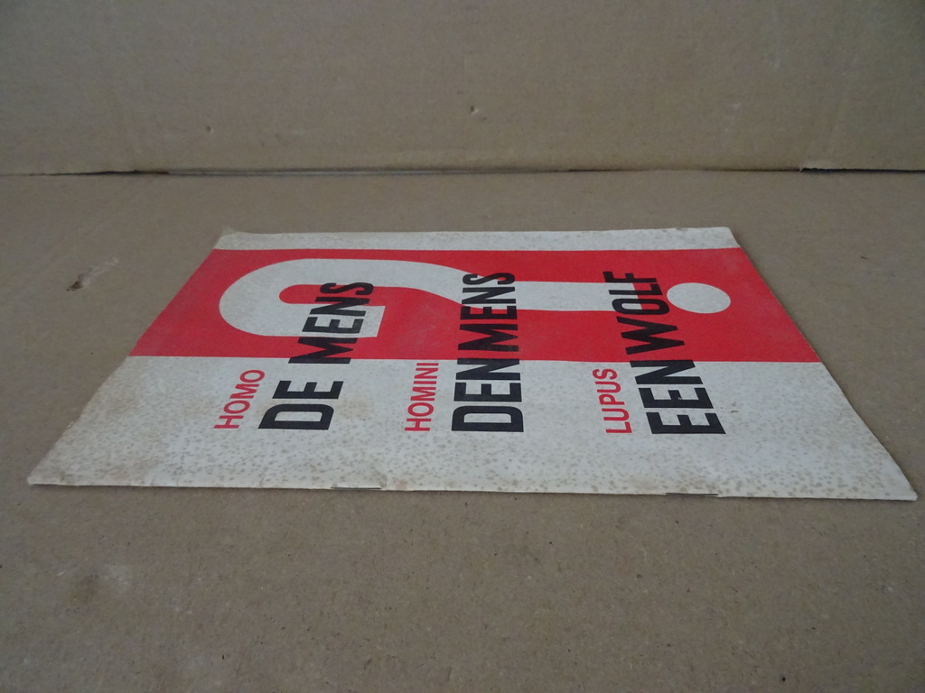 Homo homini lupus De reizende tentoonstelling over Onderdrukking en verzet in de jaren 1940-1945, eerste druk uit 1965. In redelijke gebruikte staat met wat golvingen, kreukjes en vlekjes, zie foto’s. Gelezen, van binnen nog redelijk net. Wel nog prima om te lezen. 12 pagina’s. Met indrukwekkende foto’s in zwart wit. Homo homini lupus is een Latijns gezegde dat betekent “de mens is een wolf voor zijn medemens”. Zeldzaam boekje.