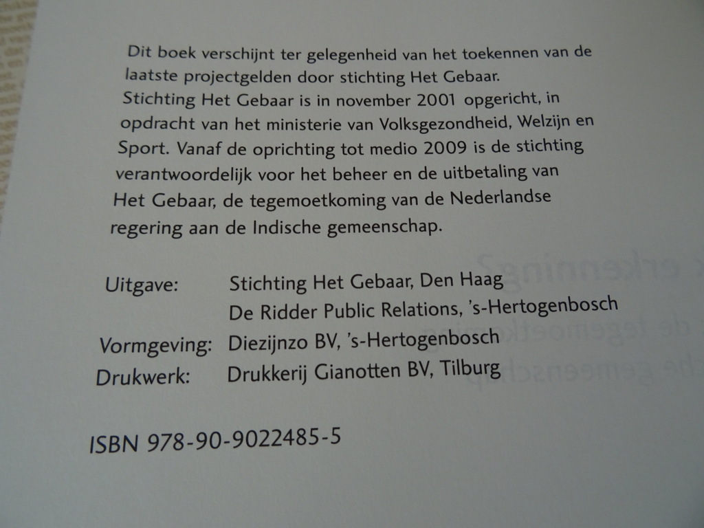 Ilonka M. de Ridder Eindelijk erkenning?, Het gebaar: de tegemoetkoming aan de Indische gemeenschap, eerste druk uit 2007. In een prachtige gebruikte staat, lijkt ongelezen. 110 pagina’s. Er zijn slechts wat sporen van ouderdom aan het losse omslagblad, zie foto’s. Er zijn 2 exemplaren op voorraad voor 9 euro per stuk.