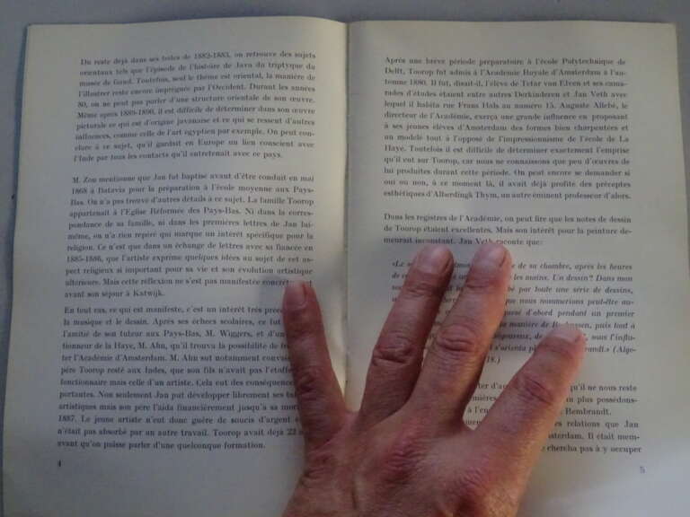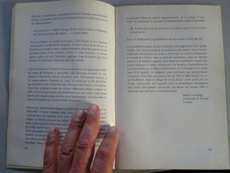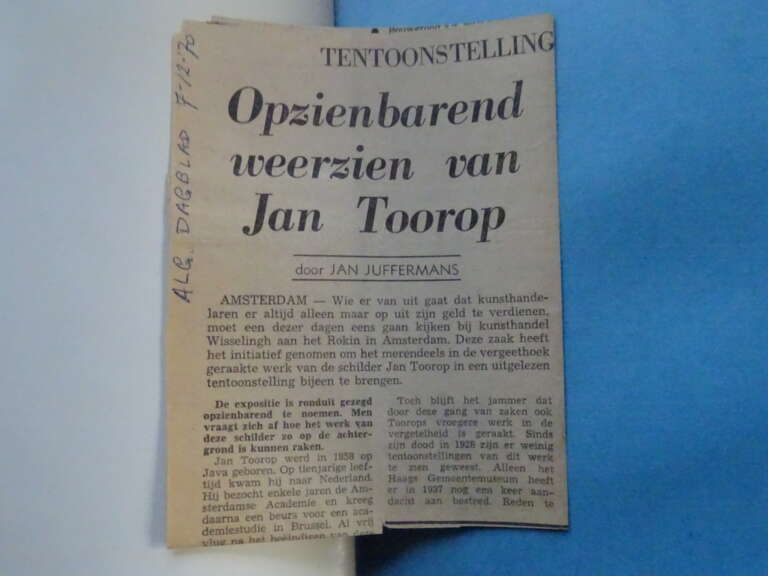 Robert Siebelhoff Jan Toorop catalogus expositie 1970, eerste druk uit 1970. De Franse catalogus hoorde bij een tentoonstelling die plaatsvond in Amsterdam van 9 november tot 12 december 1970. Bevat 17 fraaie zwart wit foto’s van werken van Jan Toorop (1858-1928). In een prachtige gebruikte staat, licht verbogen maar van binnen nog mooi, lijkt ongelezen of haast niet gelezen. 35 Pagina’s. Er is ook een krantenartikel bij uit 1970, zie foto’s. Johannes [Jan] Theodorus Toorop. Exposition de quelques tableaux, aquarelles et dessins provenant de musées et collections privées Néerlandaises. E.J. van Wisseling & Co., Amsterdam, 1970