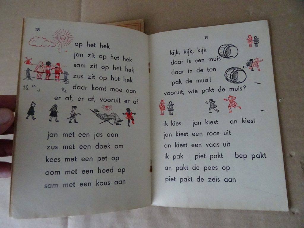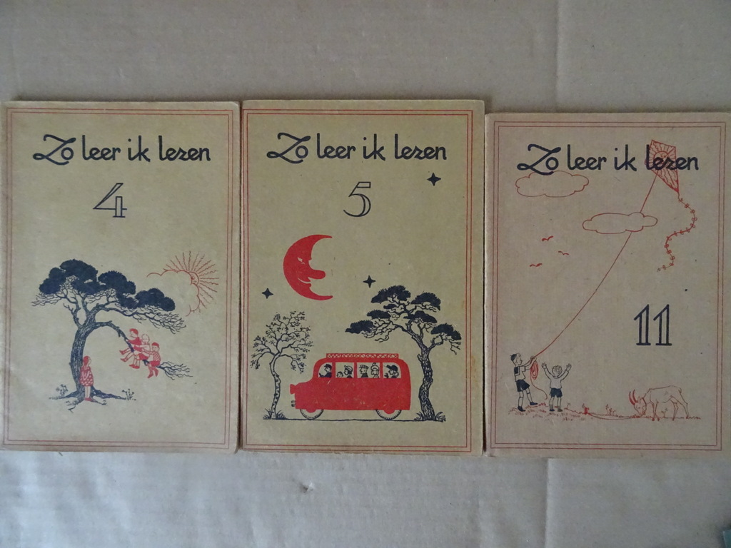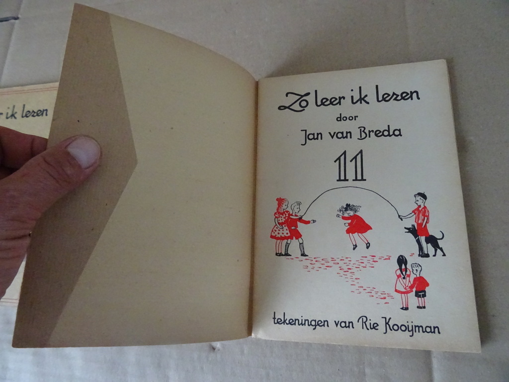 Jan van Breda Zo leer ik lezen 3 4 5 en 11, vermoedelijk eerste drukken uit circa 1945 of enkele jaren later. Twee van de drie boekjes zijn in een prachtige gebruikte staat. Deel 11 is in redelijke staat, wat los aan het raken, zie foto’s. Alle vier de boekjes zijn gelezen maar van binnen nog best mooi gezien de leeftijd. 36, 36 en 38 pagina’s. Met prachtige tekeningen van Broeder Aloysius.