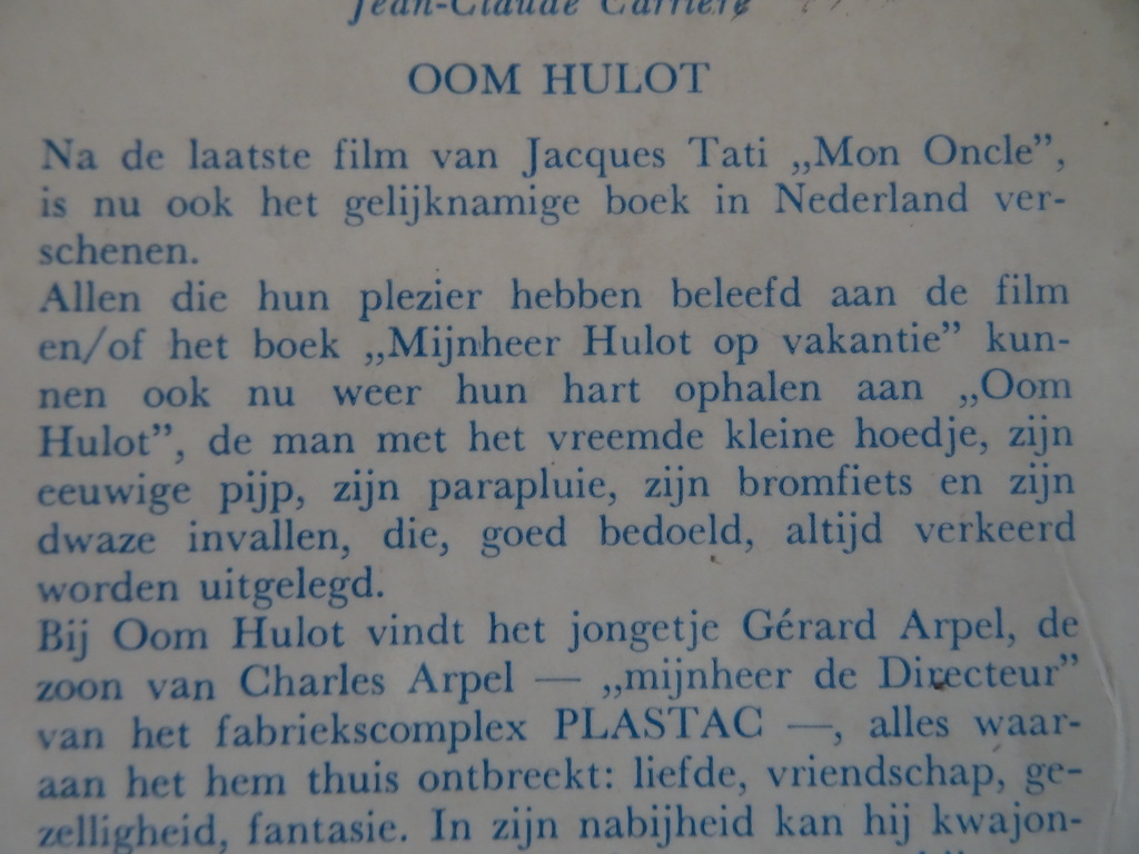 Jean-Claude Carrière Oom Hulot, Roman naar de film van Jacques Tati met Illustraties van Pierre Étaix, eerste Nederlandse druk zonder jaartal, 1959. Fontein-Boekerij No. 12. Vertaling van Frans van Oldenburg Ermke. In een prachtige gebruikte staat, zie foto’s. Van binnen nog mooi, lijkt ongelezen. 173 pagina’s.