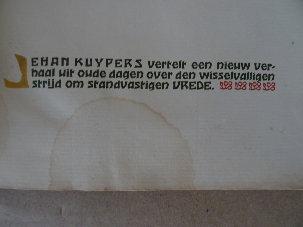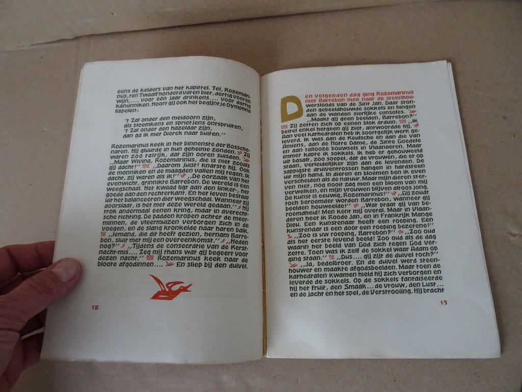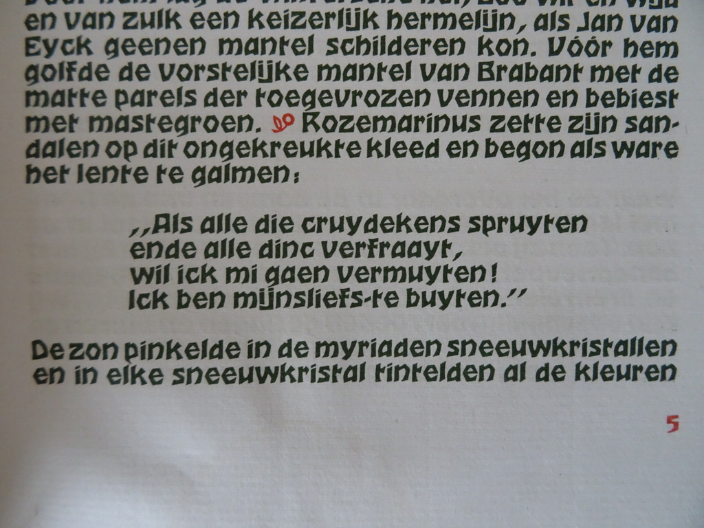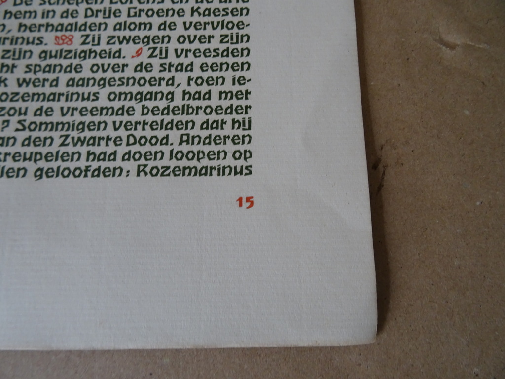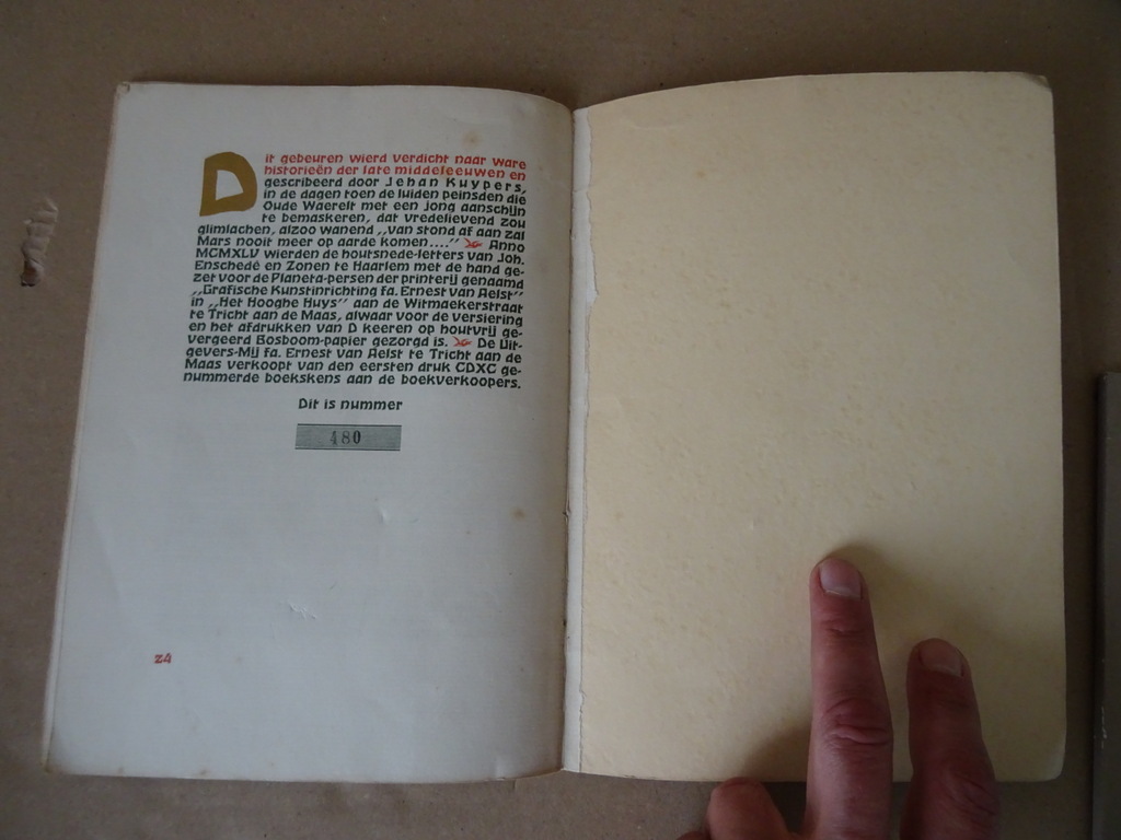 Jehan Kuijpers Rozemarinus, eerste druk uit 1945. Nummer 480 van de 500 genummerde eerste exemplaren. In goede gebruikte staat, zie foto’s. Gelezen, van binnen nog redelijk net, wat minuscule vouwtjes en leessporen. Wel nog prima om te lezen. 24 pagina’s. In quasi-oud-Nederlands geschreven verhaal dat in de late Bossche middeleeuwen. De titelfiguur heet op het omslag Rosemarinus. Jehan Kuijpers (1907-1983) was journalist van het Eindhovens Dagblad en Chinareiziger vóór dat gewoon was.