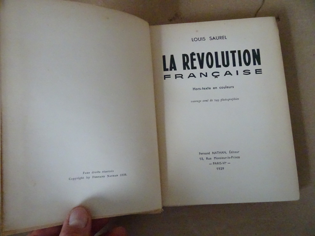 Louis Saurel La Révolution Française, orné de 149 photographies, hors-texte en couleurs, eerste druk uit 1939. Gebonden boek in een prachtige gebruikte staat, zie foto’s. Van binnen nog mooi afgezien van enkele vlekjes, lijkt ongelezen. 159 +1 pagina’s. Met schitterende prenten in zwart wit, enkele in kleur.