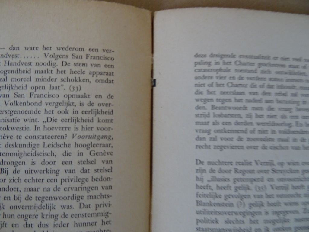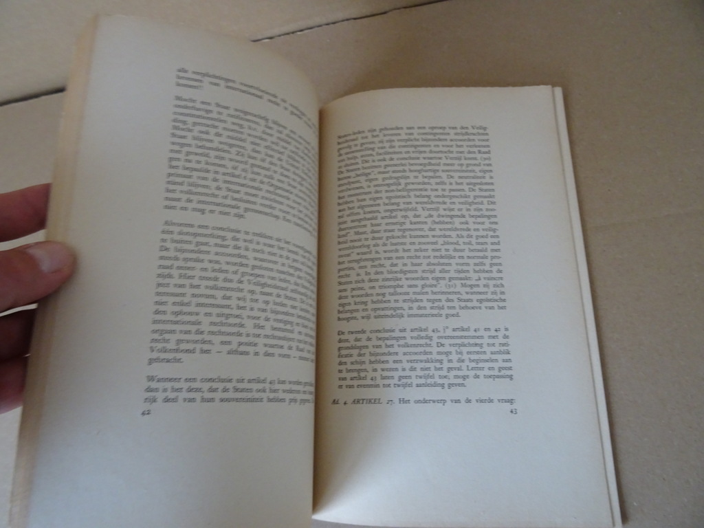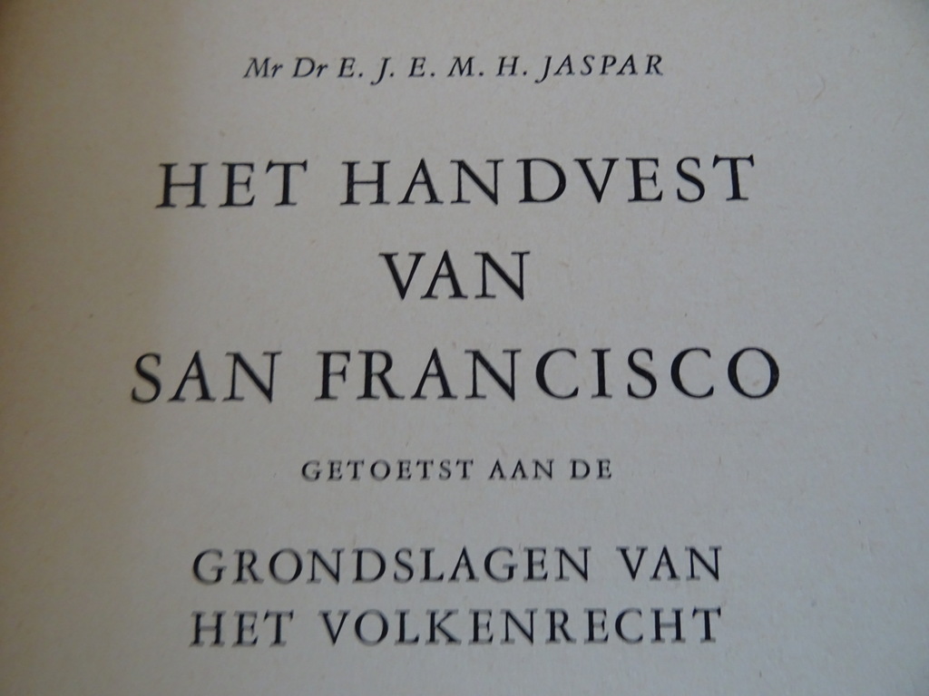 Mr. Dr. E. J. E. M. H. Jaspar Het handvest van San Francisco getoetst aan de grondslagen van het Volkerenrecht, eerste druk uit 1945. In redelijke gebruikte staat, kaft vastgeplakt met plakband, zie foto’s. Om te voorkomen dat de kaft loslaat zal binnenin ook wat plakband geplakt moeten worden. Van binnen nog best net, lijkt ongelezen of haast ongelezen. 71 pagina’s. Een zeer zeldzaam boekje, een waar museumstuk. U vindt het alleen bij ons.