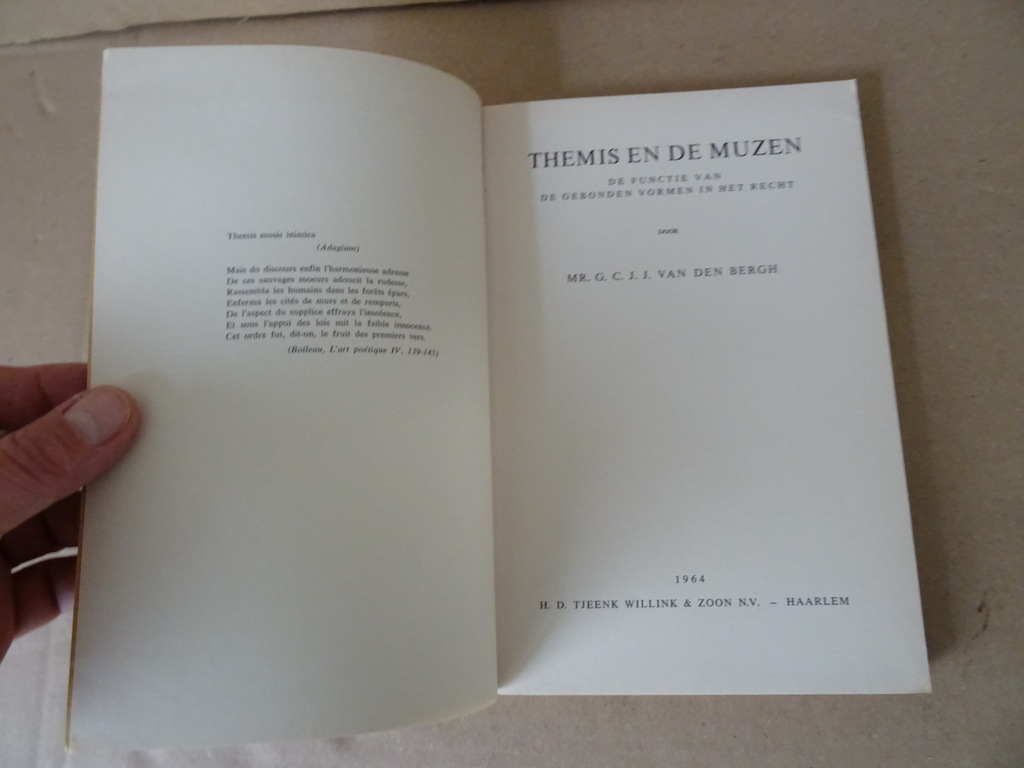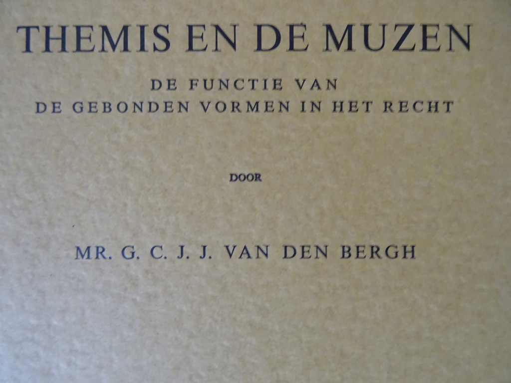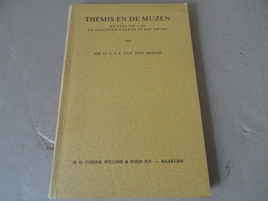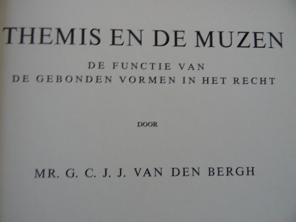 Mr. G. C. J. J. van den Bergh Themis en de muzen, de functie van de gebonden vormen in het recht, eerste druk uit 1964. In goede gebruikte staat, zie foto’s. Van binnen nog mooi, lijkt ongelezen. 174 pagina’s. Proefschrift Universiteit van Amsterdam.
