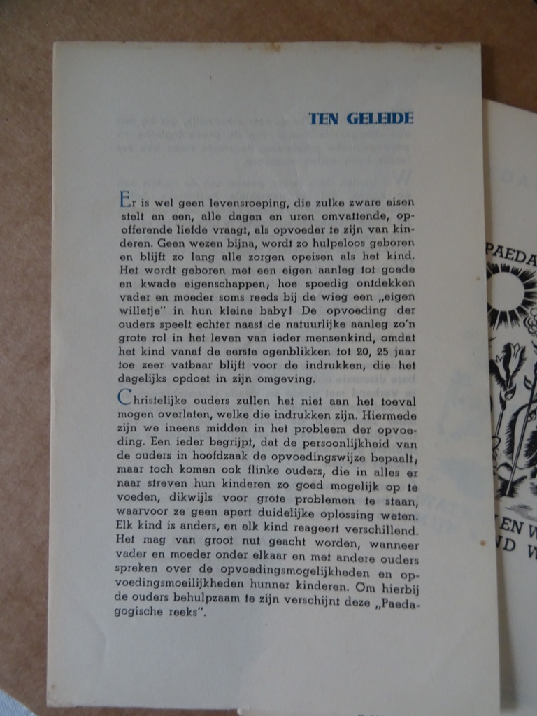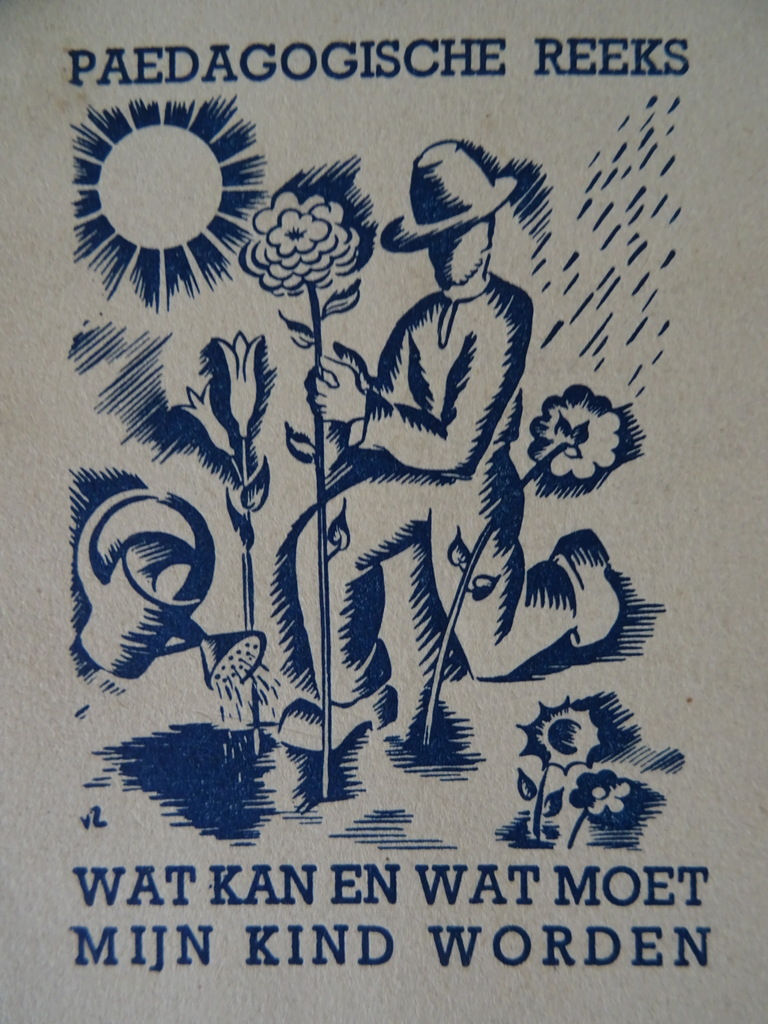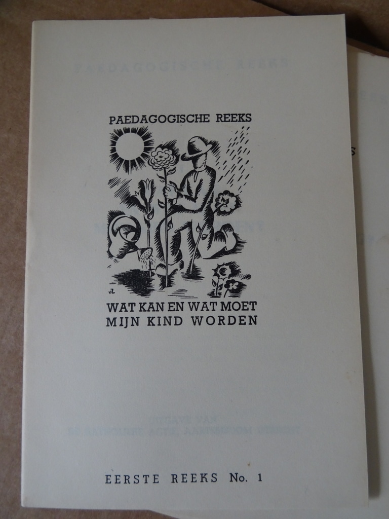 Wat kan en moet mijn kind worden door Dr. A.M.J. Chorus, hoogstwaarschijnlijk eerste druk, uitgegeven na 1937, geen jaartal. Van dit zeldzame pakket met Paedagogische boekje kan ik geen tweede exemplaar ontdekken op internet. In 1937 studeerde Alphons Chorus in Nijmegen cum laude af in de psychologie, het zal dus in ieder geval niet van voor 1937 zijn. Het pakket is compleet met de 6 boekjes en het blaadje met inleiding. Het papieren mapje is in redelijke staat, de boekjes in nog vrij goede staat, ongelezen.