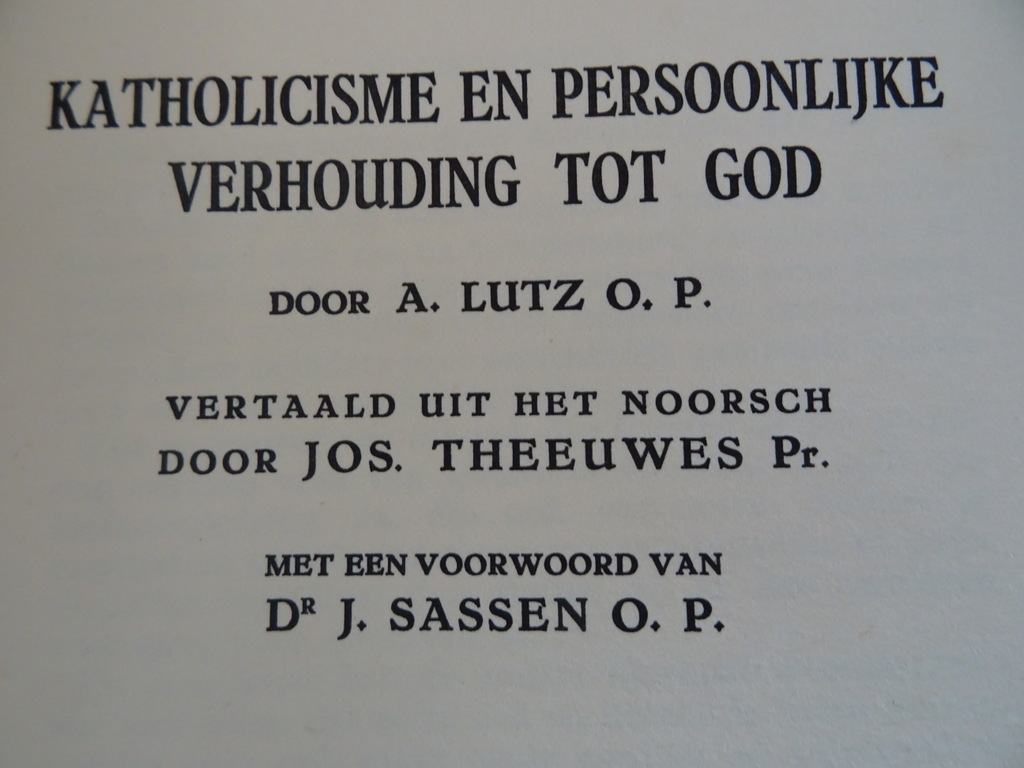 A. Lutz Katholicisme en persoonlijke verhouding tot God, eerste Nederlandse druk uit 1929. Vertaald uit het Noorsch door Jos. Theeuwes. In een prachtige gebruikte staat, zie foto’s. Van binnen nog mooi, in ieder geval ongelezen. De pagina’s dienen nog losgesneden te worden. Indien gewenst wordt dit nog gedaan voor u (zo goed als mogelijk). 68 pagina’s. Afkomstig uit de collectie van een pastoor op leeftijd.