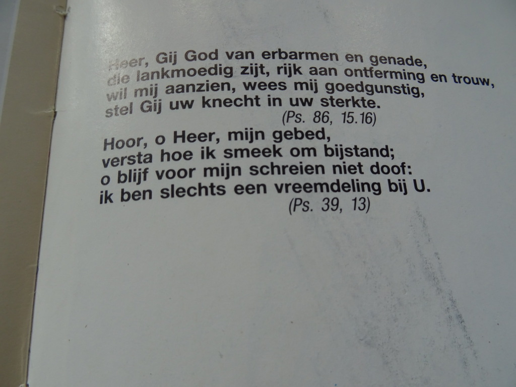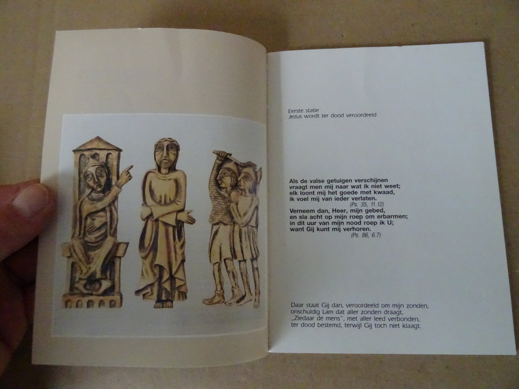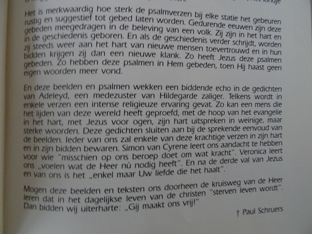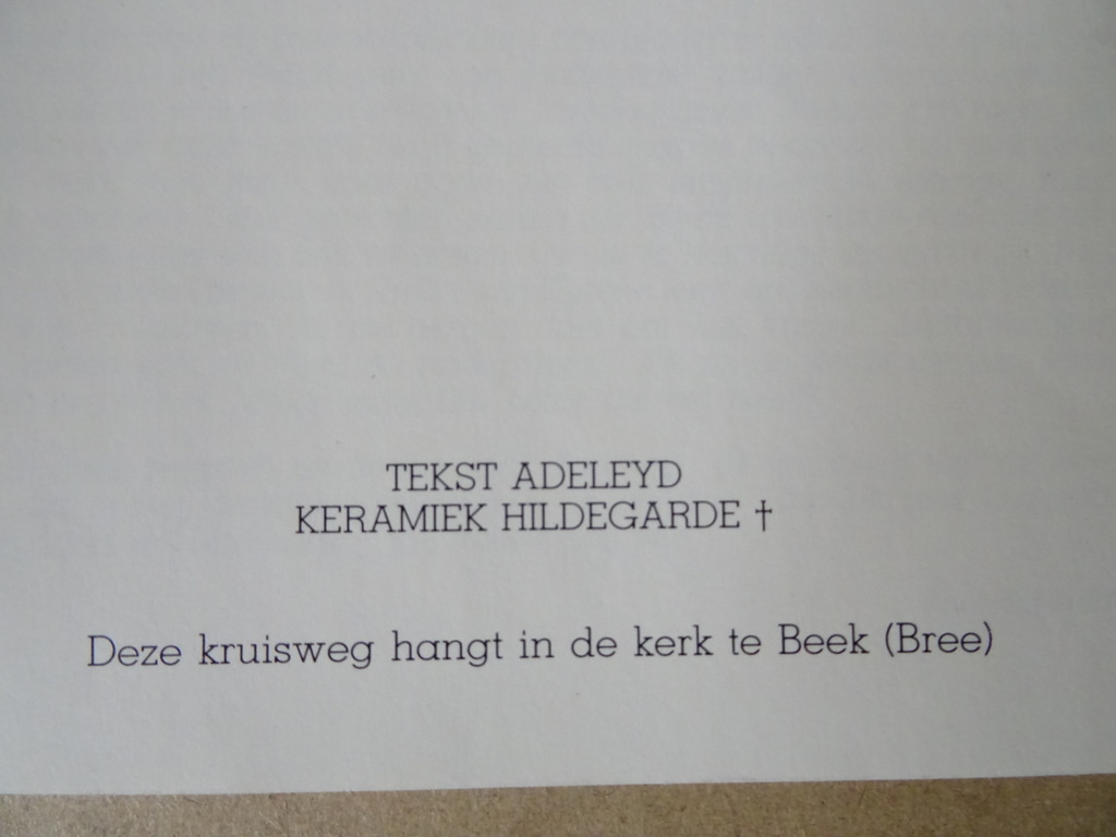 Adeleyd Ook nu nog gaat Uw Kruisweg verder, eerste druk uit 1989. Gebonden boekje in goede gebruikte staat, vouwtje in bovenste helft, zie foto’s. Gelezen, van binnen nog redelijk net, er zijn wat leessporen. 48 ongenummerde pagina’s. Bevat schitterende prenten met hierop afgebeeld de Kruiswegstaties van keramiek van Hildegarde. Deze kruisweg hangt in de kerk te Beek. Afkomstig uit de collectie van een pastoor op leeftijd. Adeleyd is mogelijk een pseudoniem voor Zuster Rosa Olaerts.