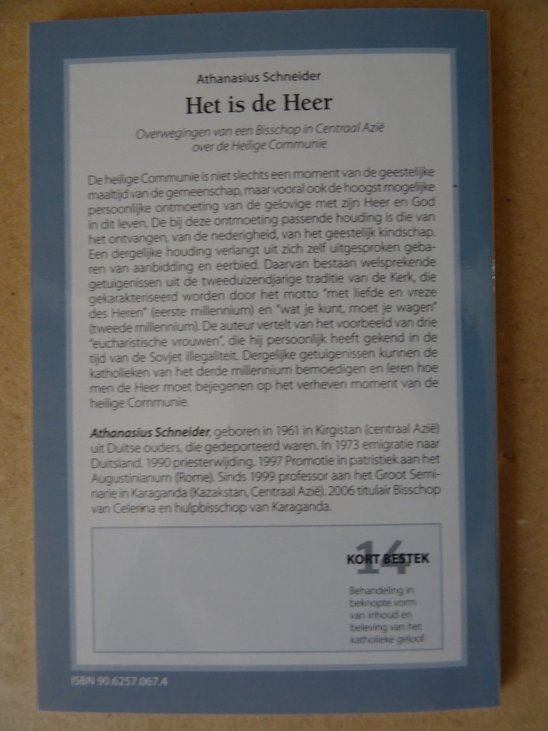 Athanasius Schneider Het is de Heer, Overwegingen van een Bisschop in Centraal Azië over de Heilige Communie, eerste Nederlandse druk uit 2008. In een prachtige gebruikte staat, zie foto’s. Van binnen nog mooi, haast als nieuw, lijkt ongelezen. 64 pagina’s. Afkomstig uit de collectie van een pastoor op leeftijd.