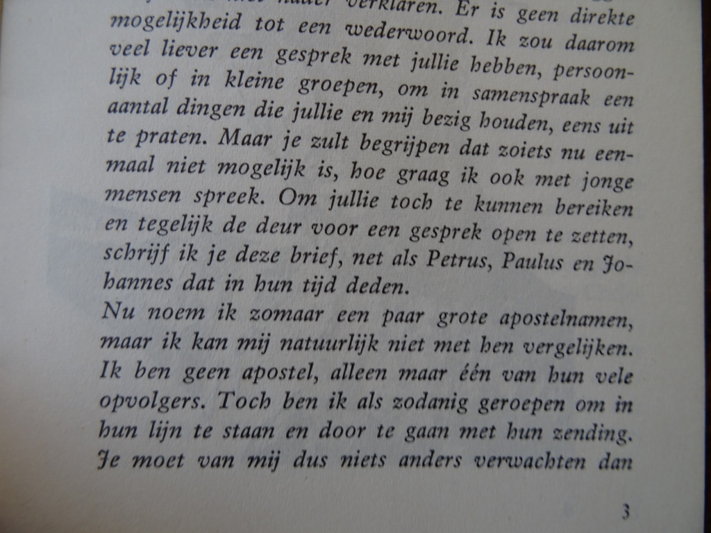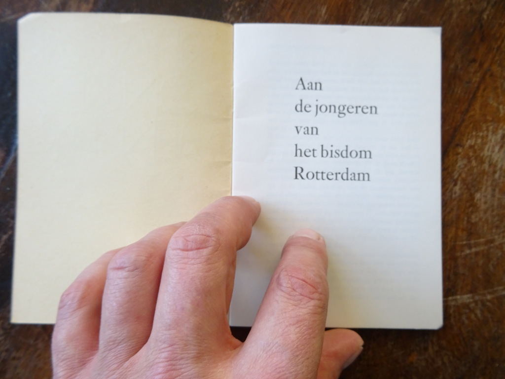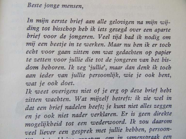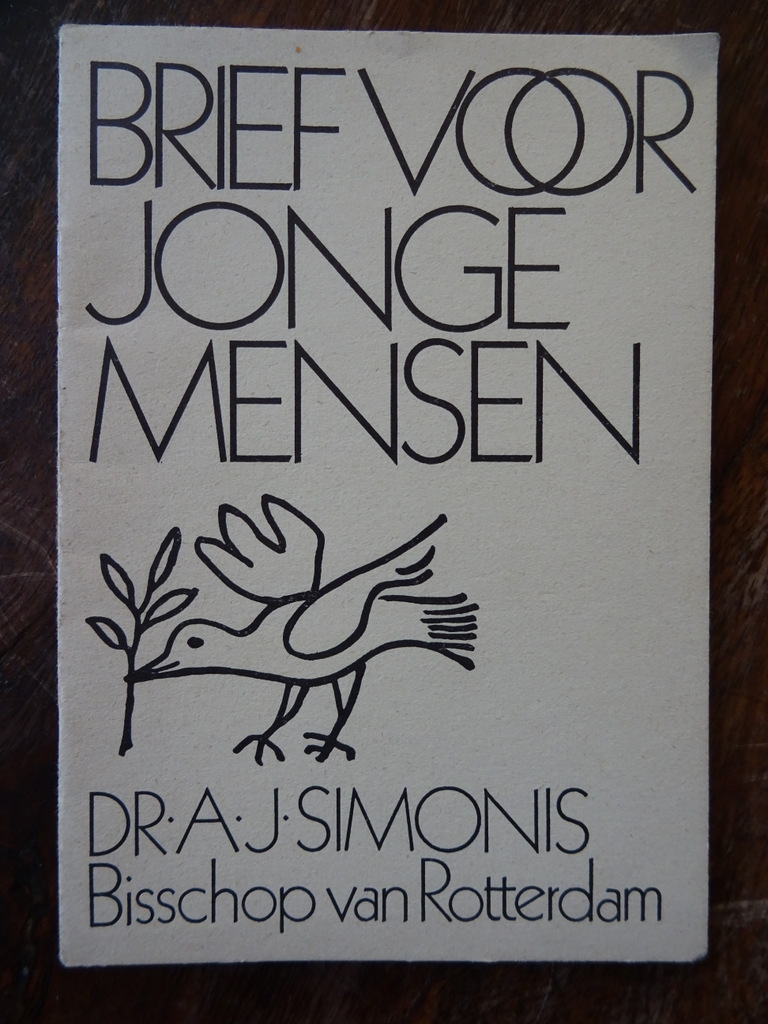 Brief voor jonge mensen DR.J. Simonis Bisschop van Rotterdam, mogelijk eerste druk uit circa 1960. In een prachtige gebruikte staat, van binnen nog vrij mooi, ongelezen, 16 pagina’s. Afkomstig uit de collectie van een pastoor op leeftijd.