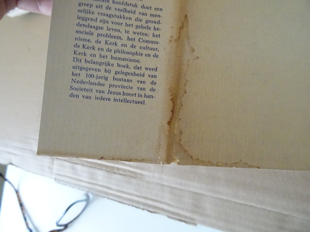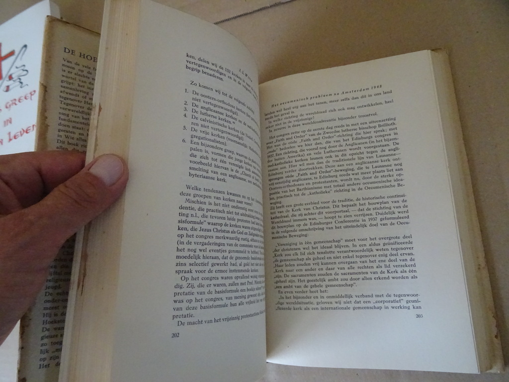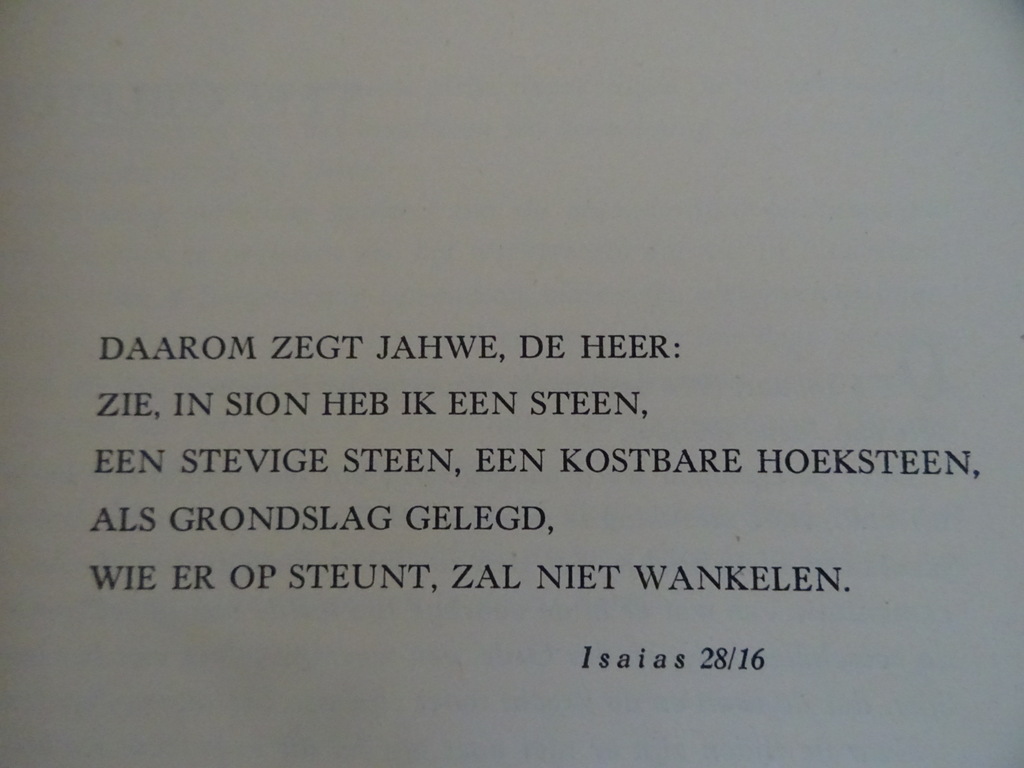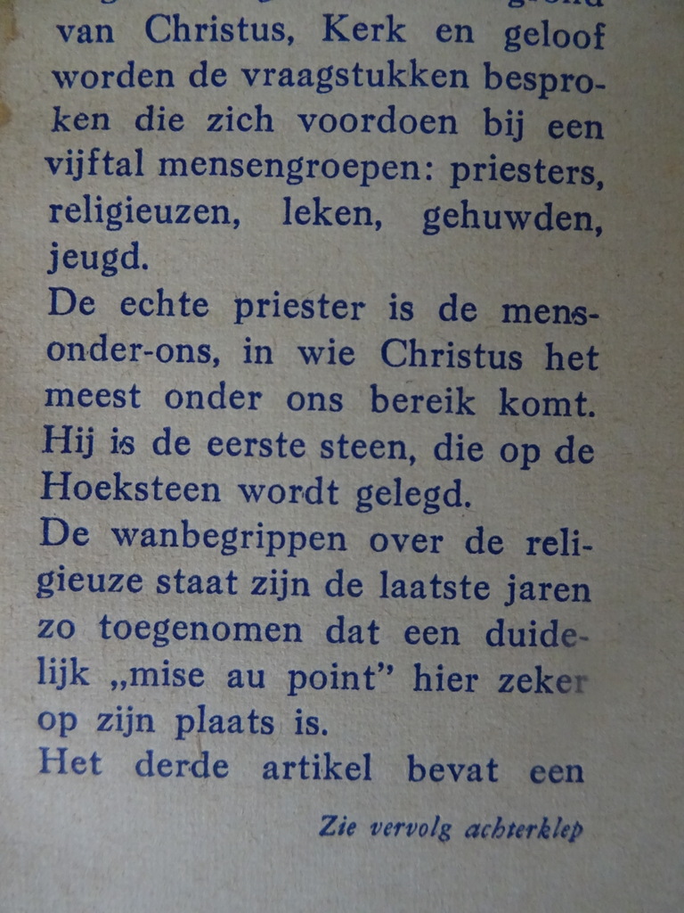C. Kerremans e.a. De hoeksteen Een katholiek getuigenis in actuele levensvragen, eerste druk uit 1949. In een prachtige gebruikte staat, één pagina met een klein scheurtje, zie foto’s. Van binnen afgezien daarvan nog mooi, lijkt ongelezen. 360 pagina’s. Afkomstig uit de collectie van een pastoor op leeftijd.