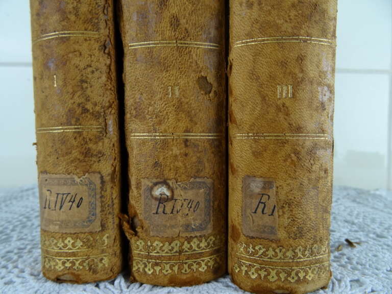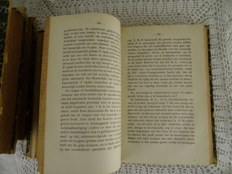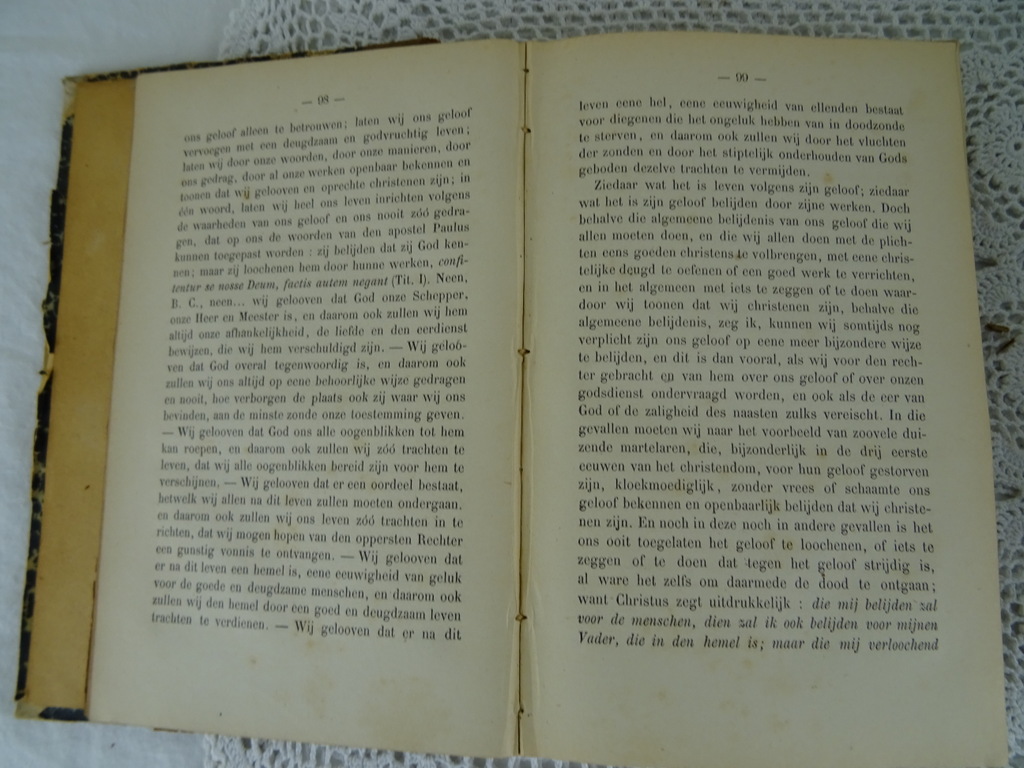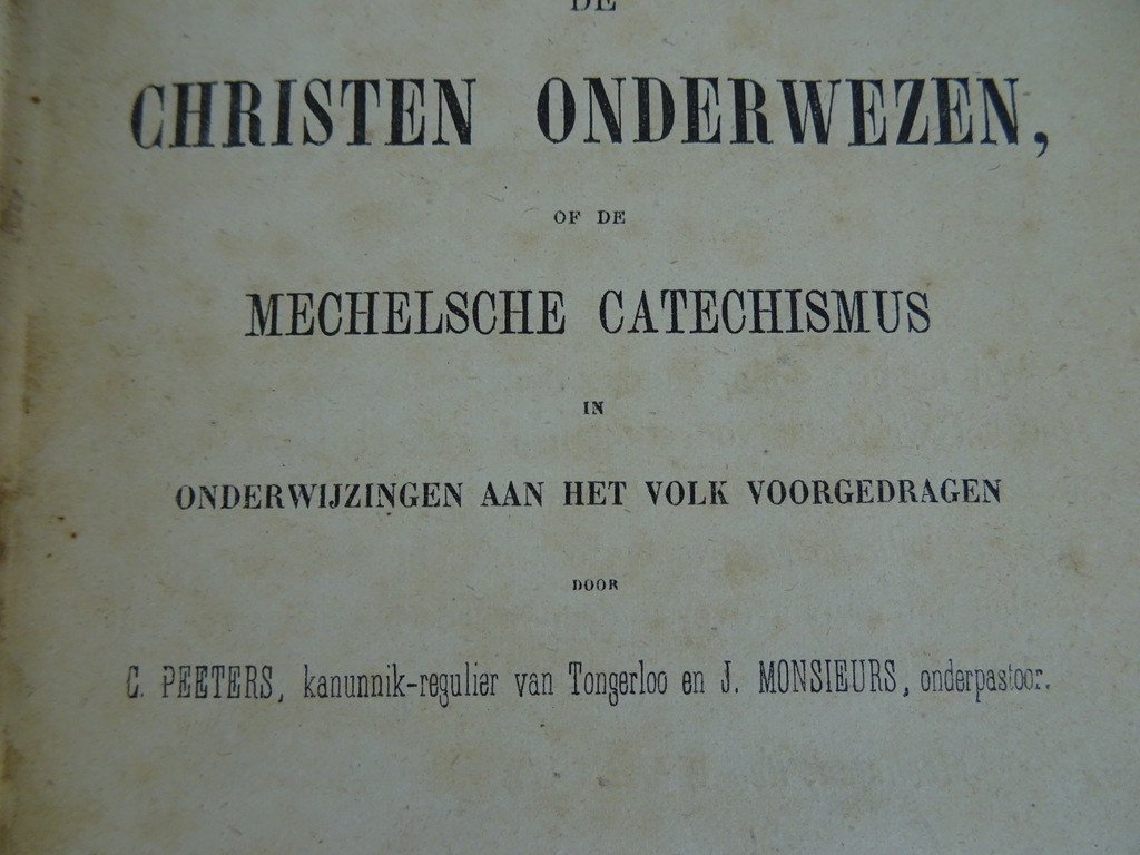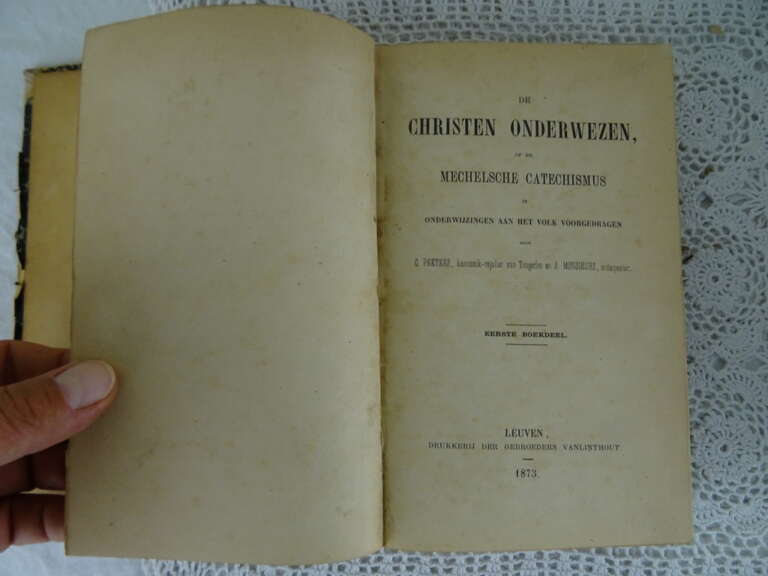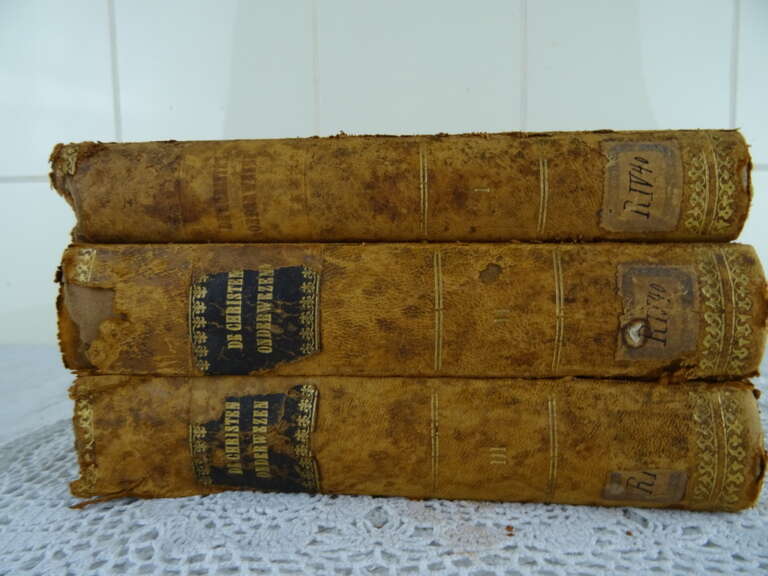 De Christen onderwezen C. Peeters uit 1873, 1874 en 1875. De Christen onderwezen of de Mechelse Catechismus in onderwijzingen aan het volk voorgedragen is de volledige titel van de serie boeken. De fraaie boeken zijn in goede gebruikte staat. De kaften zijn in redelijke staat, er vallen soms kleine stukjes af. Boek 1 heeft een losse kaft aan de binnenkant, boek 2 en 3 stukjes kaft los aan de buitenkant, zie foto’s. Aan de binnenkant zijn de boeken (de pagina’s) nog in vrij goede staat. De serie bestond uit 4 delen, boek 4 ontbreekt. Ik vond zojuist nog een papier in boek 2 met hierop een religieuze tekst. Het is geschreven in een schitterend handschrift (aantekeningen of een brief), zie foto’s.