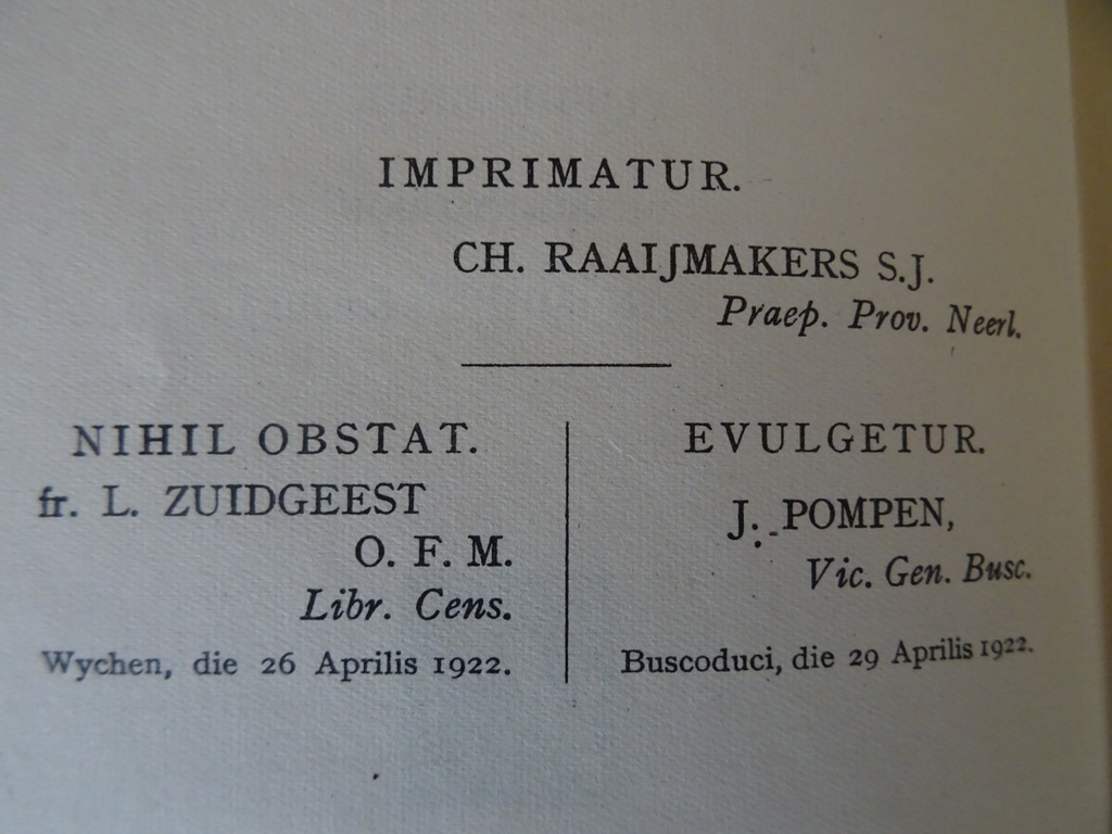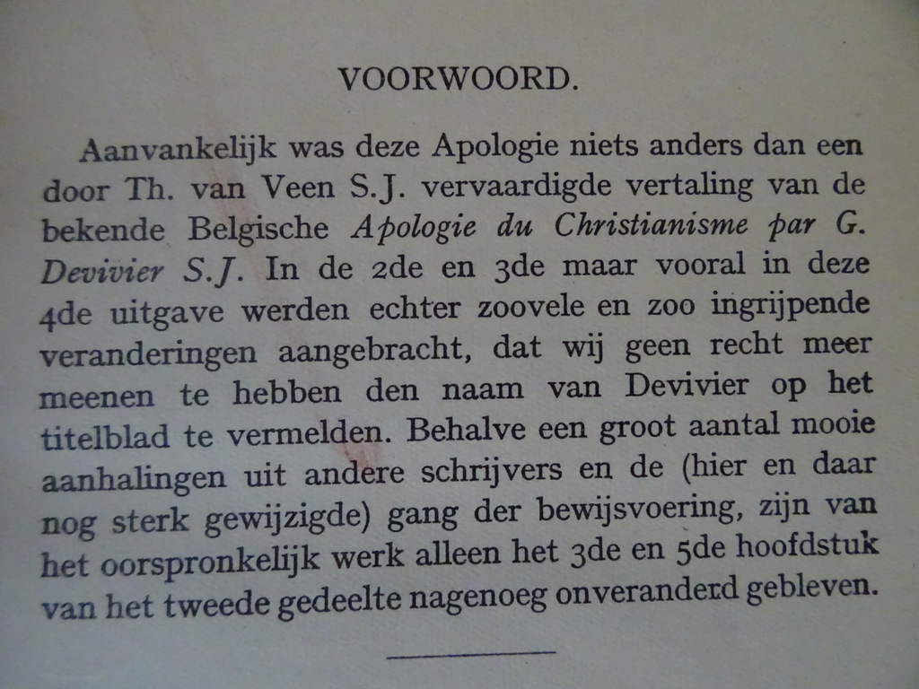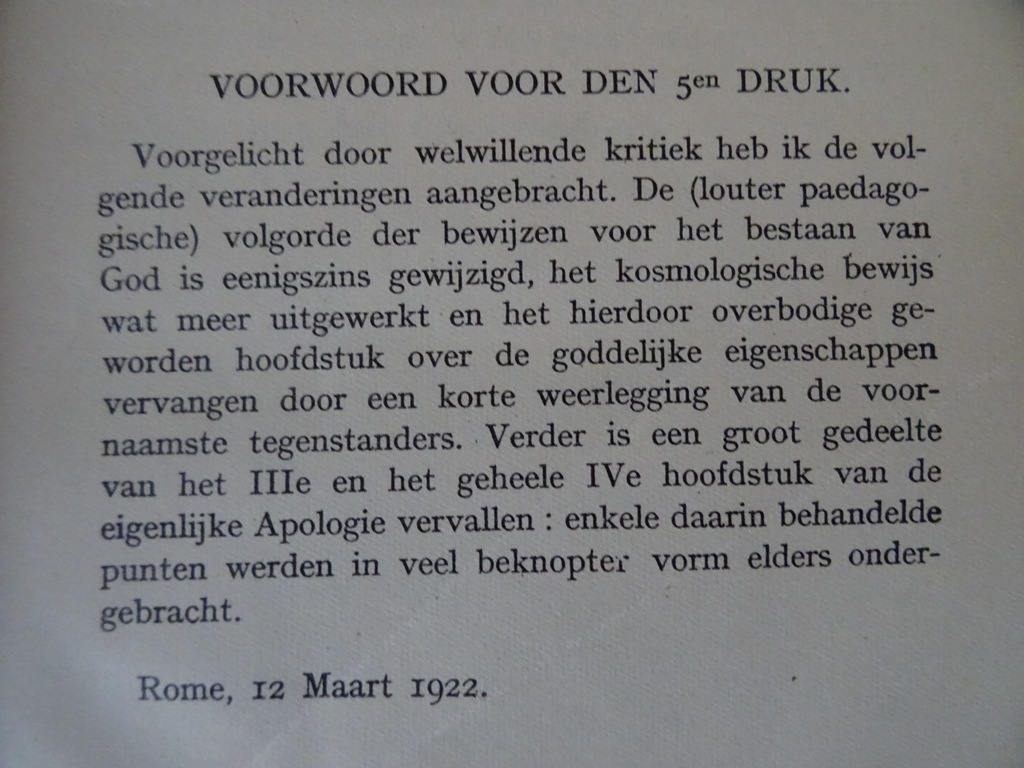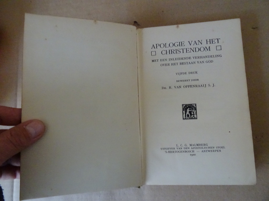 Dr. R. van Oppenraaij Apologie van het christendom met een inleidende verhandeling over het bestaan van God, bewerkt door Dr. R. van Oppenraaij, S.J., vijfde druk uit 1922. Afkomstig uit de collectie van een pastoor op leeftijd. In een prachtige gebruikte staat, zie foto’s. Van binnen nog mooi afgezien van wat vouwtjes, lijkt ongelezen of haast ongelezen. 334 pagina’s.