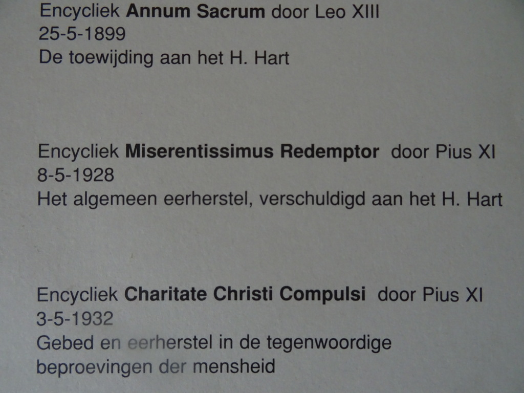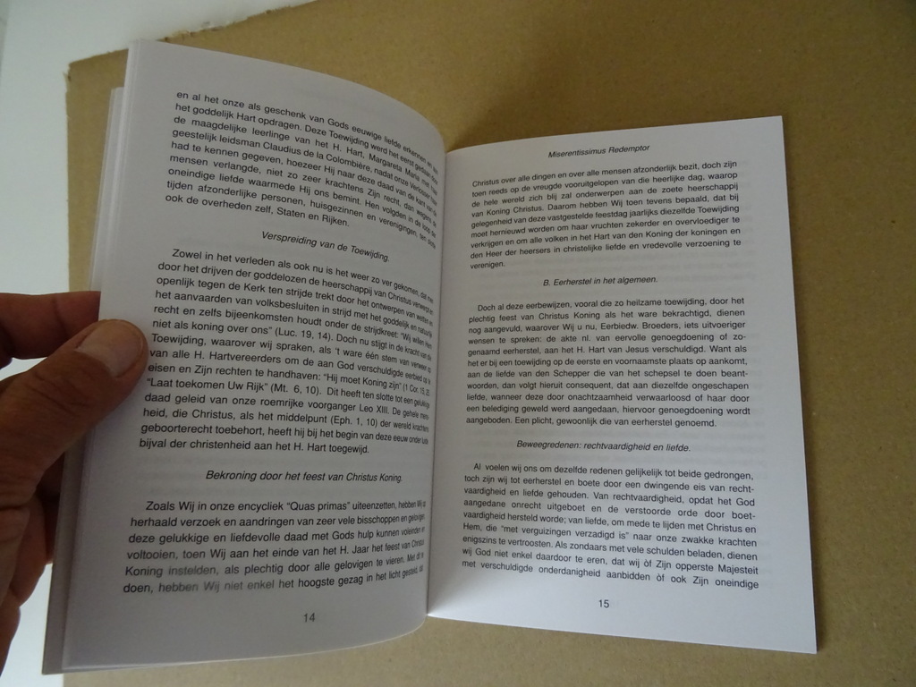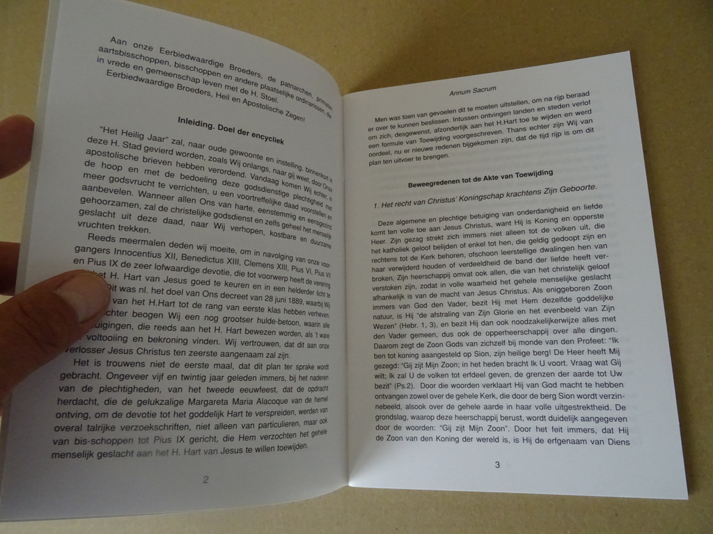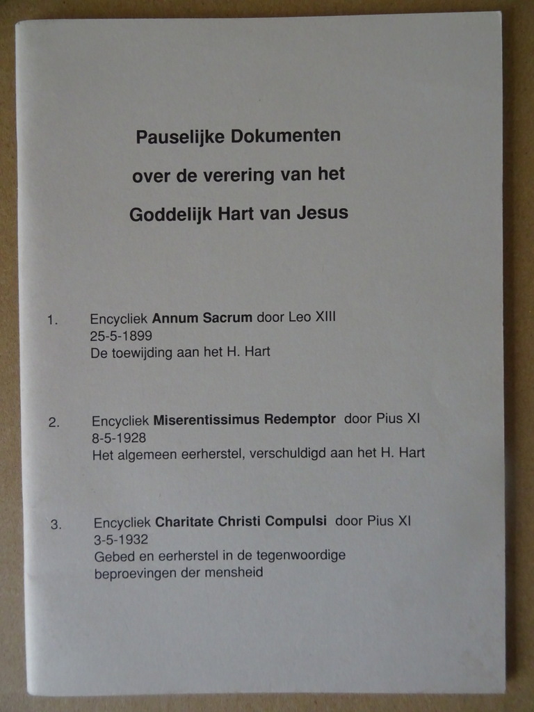Encyclieken Annum Sacrum Miserentissimus Redemptor en Charitate Christi Compulsi ofwel Pauselijke Documenten over de Verering van het Goddelijk Hart van Jesus, de drie grote Heilig Hart encyclieken, eerste druk zonder jaartal. Uitgegeven door het Apostolaat van Eerherstel. In een schitterende gebruikte staat, zie foto’s. Van binnen nog mooi, lijkt ongelezen. 45 pagina’s. Afkomstig uit de collectie van een pastoor op leeftijd.