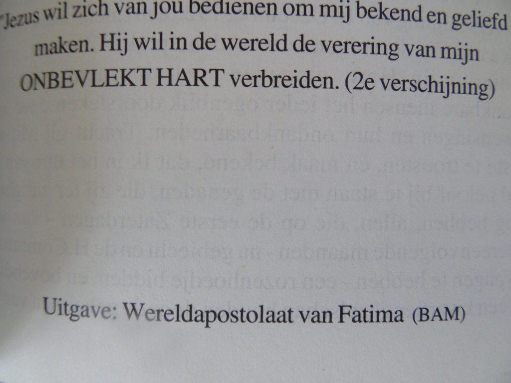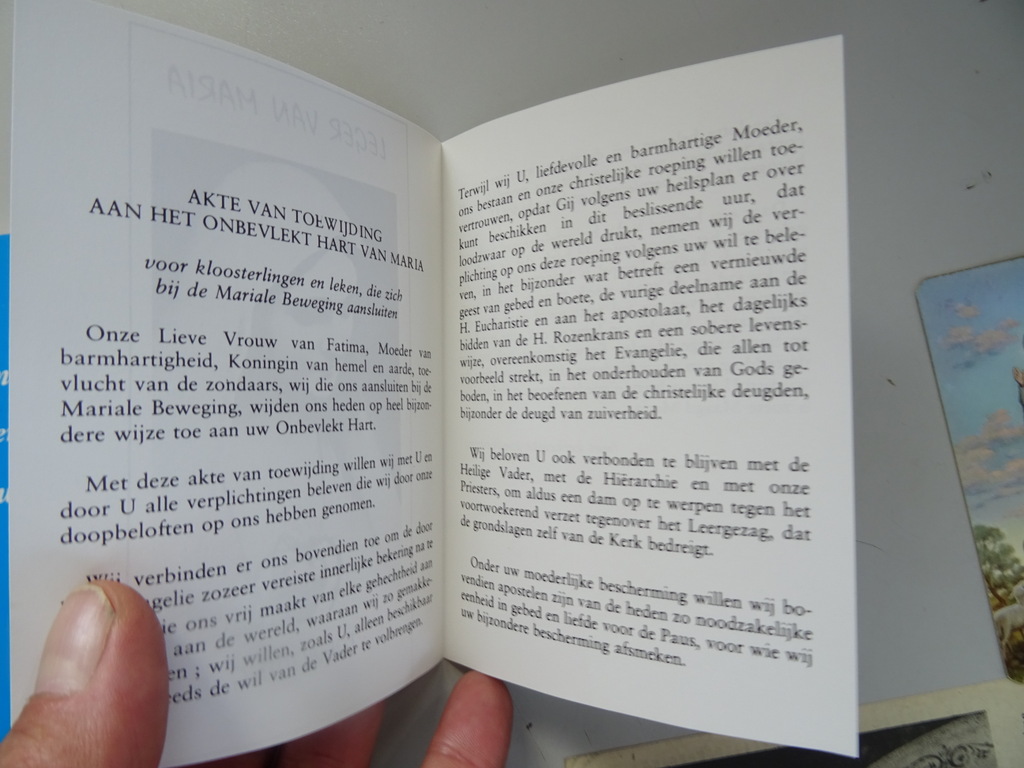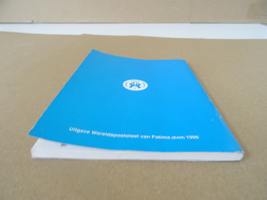 Gebeden en Oefeningen ter ere van O.L. Vrouw van Fatima, eerste druk uit 1996. Uitgegeven door het Wereldapostolaat van Fatima (BAM). Zakformaat boekje in een prachtige gebruikte staat, zie foto’s. Van binnen nog mooi, lijkt ongelezen of haast ongelezen. 80 pagina’s. Afkomstig uit de collectie van een pastoor op leeftijd. Compleet met drie mooie prentjes. Zeldzaam.