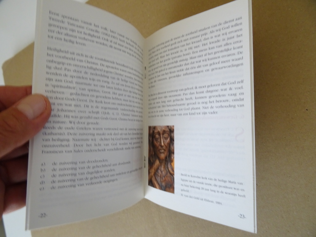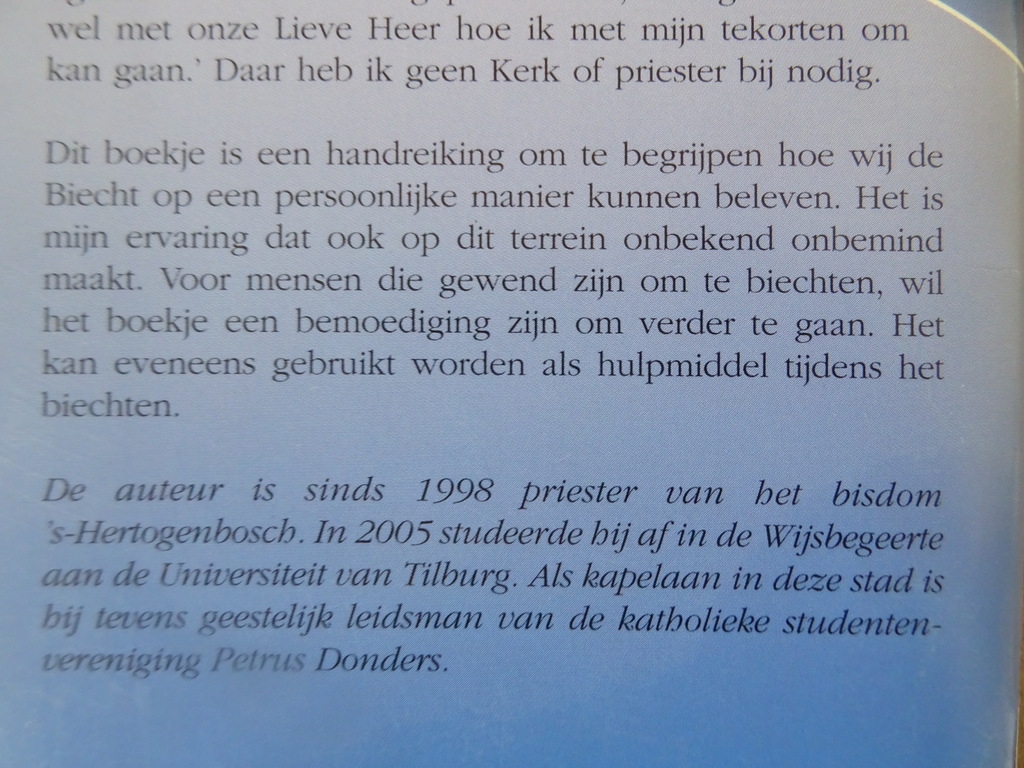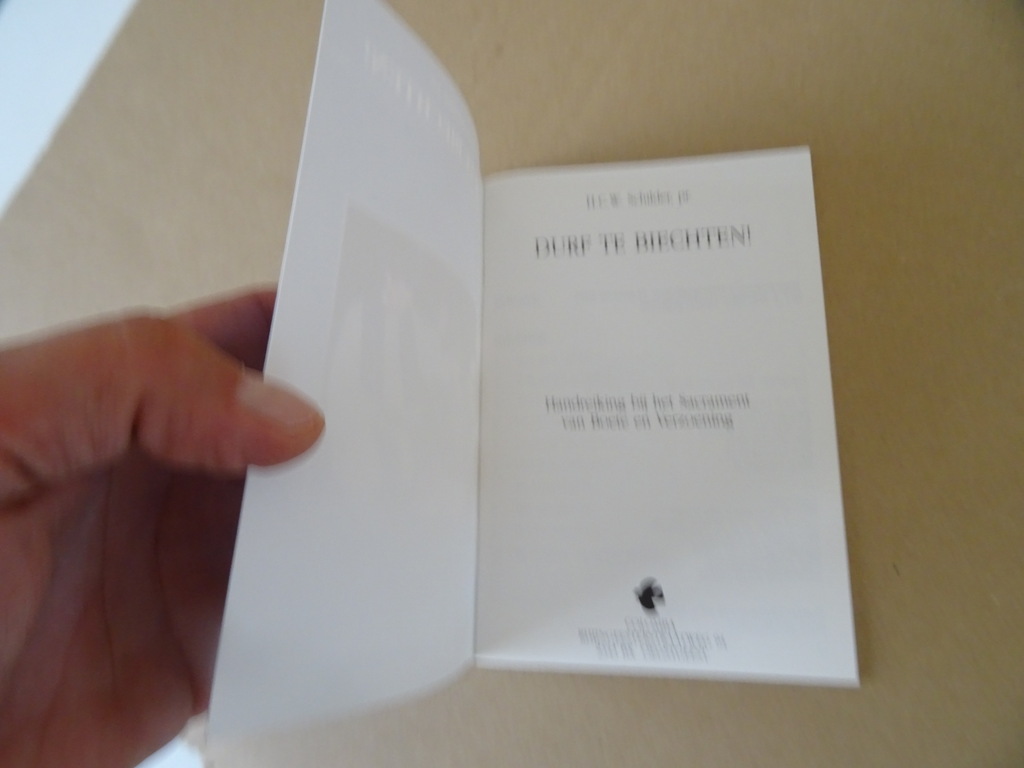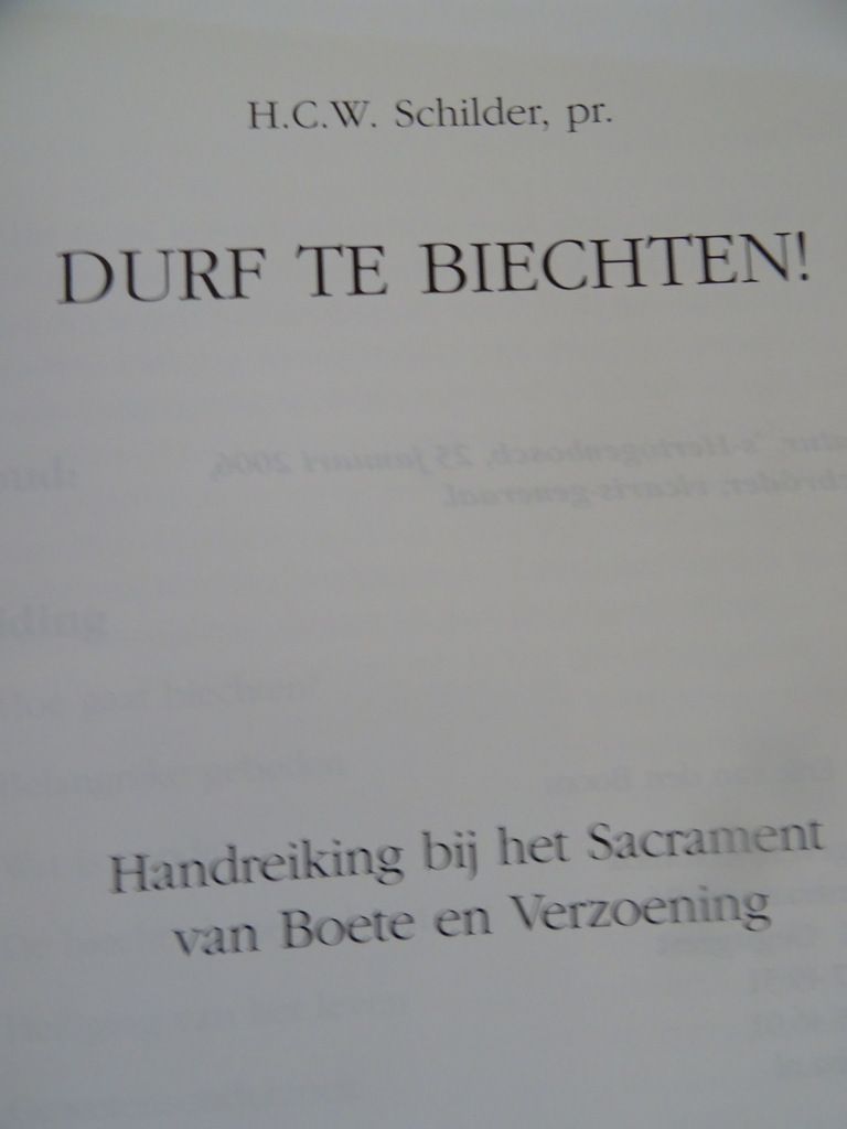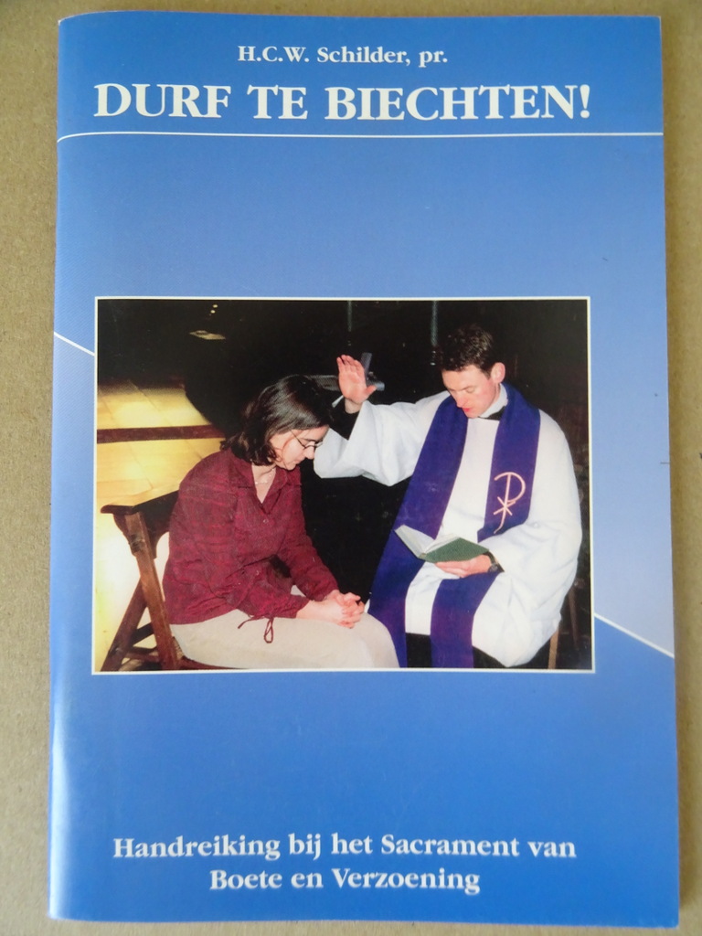 H.C.W. Schilder pr. Durf te biechten!, Handreiking bij het Sacrament van Boete en Verzoening, eerste druk uit 2006. In een schitterende gebruikte staat, zie foto’s. Van binnen nog mooi, lijkt ongelezen. 46 pagina’s. Afkomstig uit de collectie van een pastoor op leeftijd. Zeldzaam.
