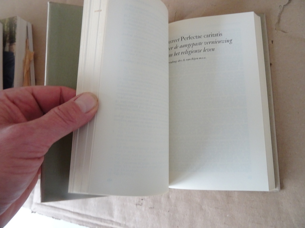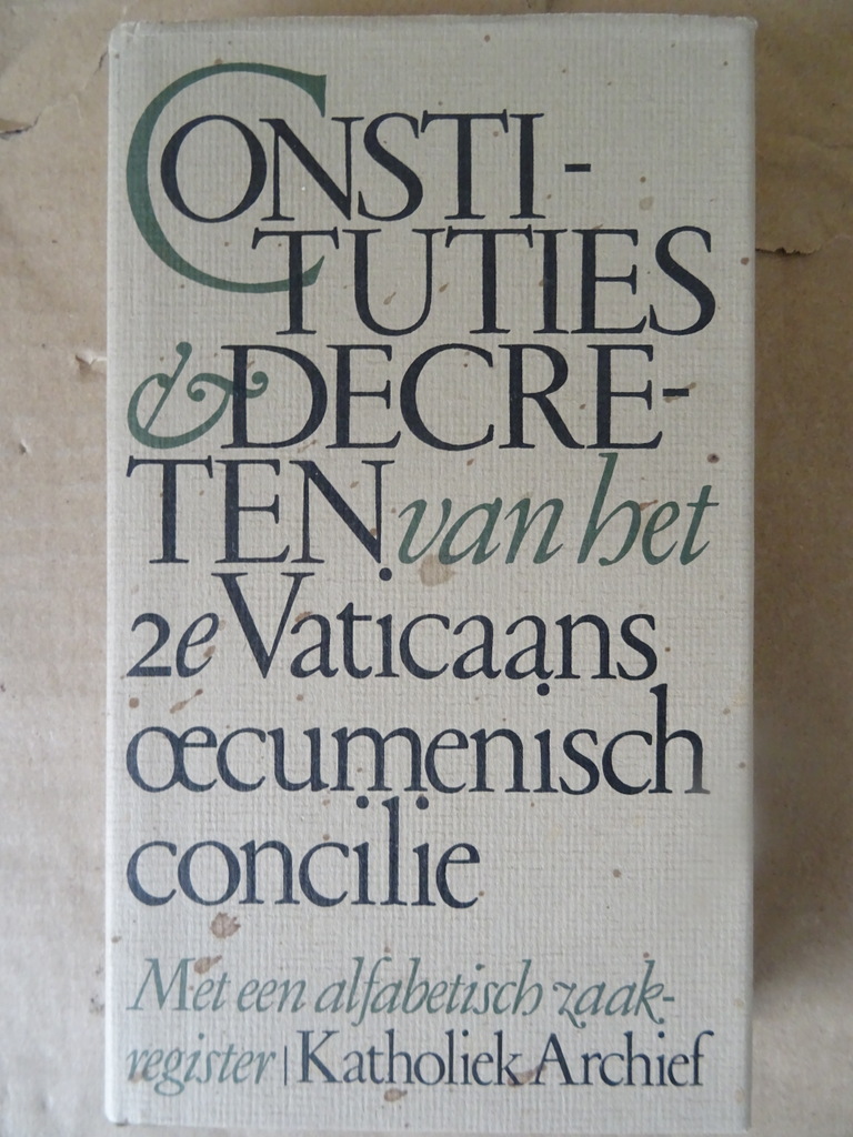 Het Tweede Vaticaans Oecumenisch Concilie oftewel Constituties en decreten van het Tweede Vaticaans Oecumenisch Concilie, eerste druk uit 1967. In een prachtige gebruikte staat, het losse omslagblad heeft slechts enkele vlekjes, zie foto’s. Van binnen nog mooi, lijkt ongelezen of haast ongelezen. 585 pagina’s. Afkomstig uit de collectie van een pastoor op leeftijd.