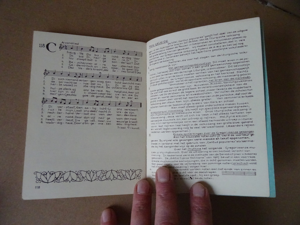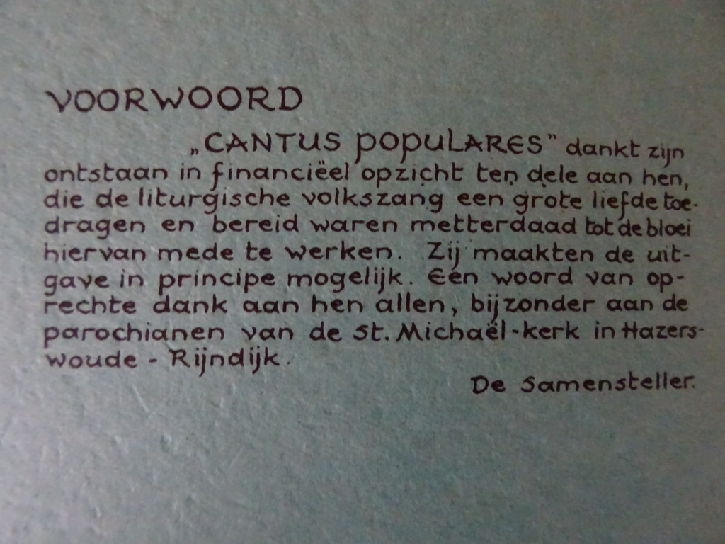 J.C. van Leeuwen Cantus Populares Volkszangbundel voor gezin, kerk en school, bevattende Gregoriaanse mis-en lofgezangen en 118 geestelijke liederen samengesteld door J.C. van Leeuwen, eerste druk uit 1953. Afkomstig uit de collectie van een pastoor op leeftijd. In goede gebruikte staat, de kaft is los aan de voorzijde. Gelezen maar van binnen nog vrij mooi. 118 Pagina’s.