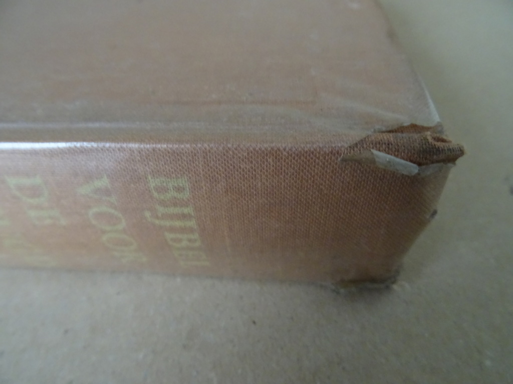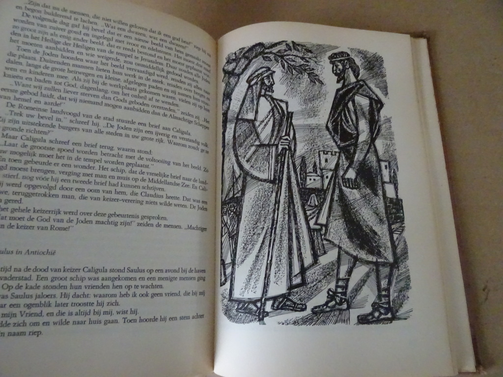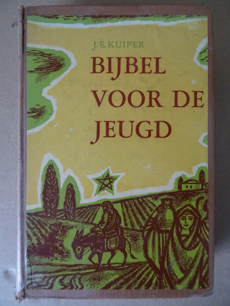 J. E. Kuiper Bijbel voor de jeugd, vijfde druk uit 1963. In goede gebruikte staat, slijtage voorin en achterin. Gelezen maar van binnen nog best net afgezien van wat leessporen. Het boek is voorzien van een plastic laag, deze begint wat te vergaan, zie foto’s. 565 pagina’s. Met schitterende illustraties (en omslag) van Kees van Lent. Afkomstig uit de collectie van een pastoor op leeftijd.