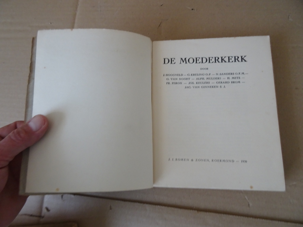 J. Hoogveld e.a. De Moederkerk, eerste druk uit 1930. In een prachtige gebruikte staat, klein scheurtje in voorkant kaft, zie foto’s. Van binnen nog best mooi, lijkt ongelezen. 227 pagina’s. Afkomstig uit de collectie van een pastoor op leeftijd.