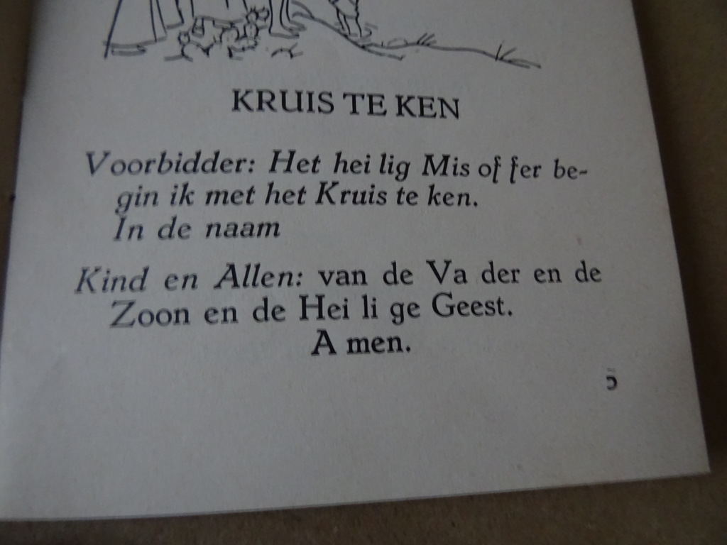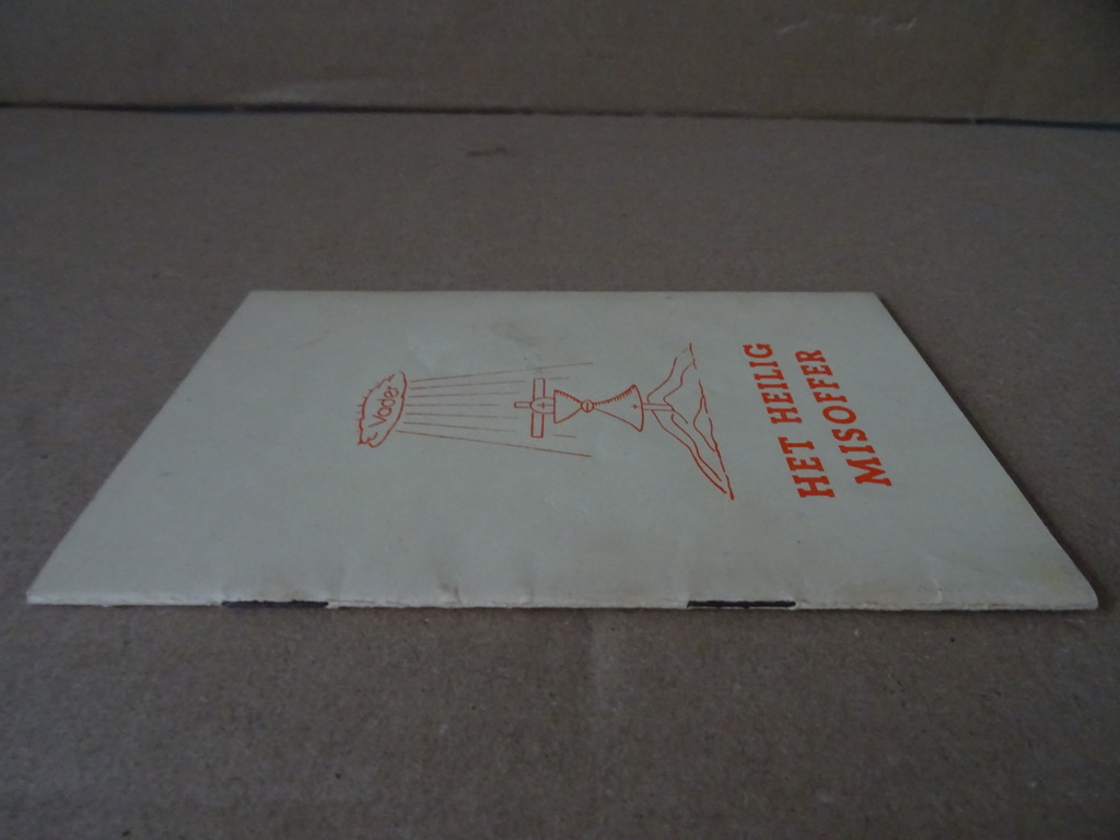 J. J. H. Gilissen Het Heilig misoffer, zesde herziene druk uit 1949. Afkomstig uit de collectie van een pastoor op leeftijd. Zeldzaam boekje in goede gebruikte staat, licht gevouwen, van buiten wat vlekjes, zie foto’s. Afgezien van de vouwtjes van binnen nog mooi, lijkt ongelezen. Ook de naam is nooit ingevuld. Met prachtige getekende afbeeldingen in zwart wit. 31 pagina’s.